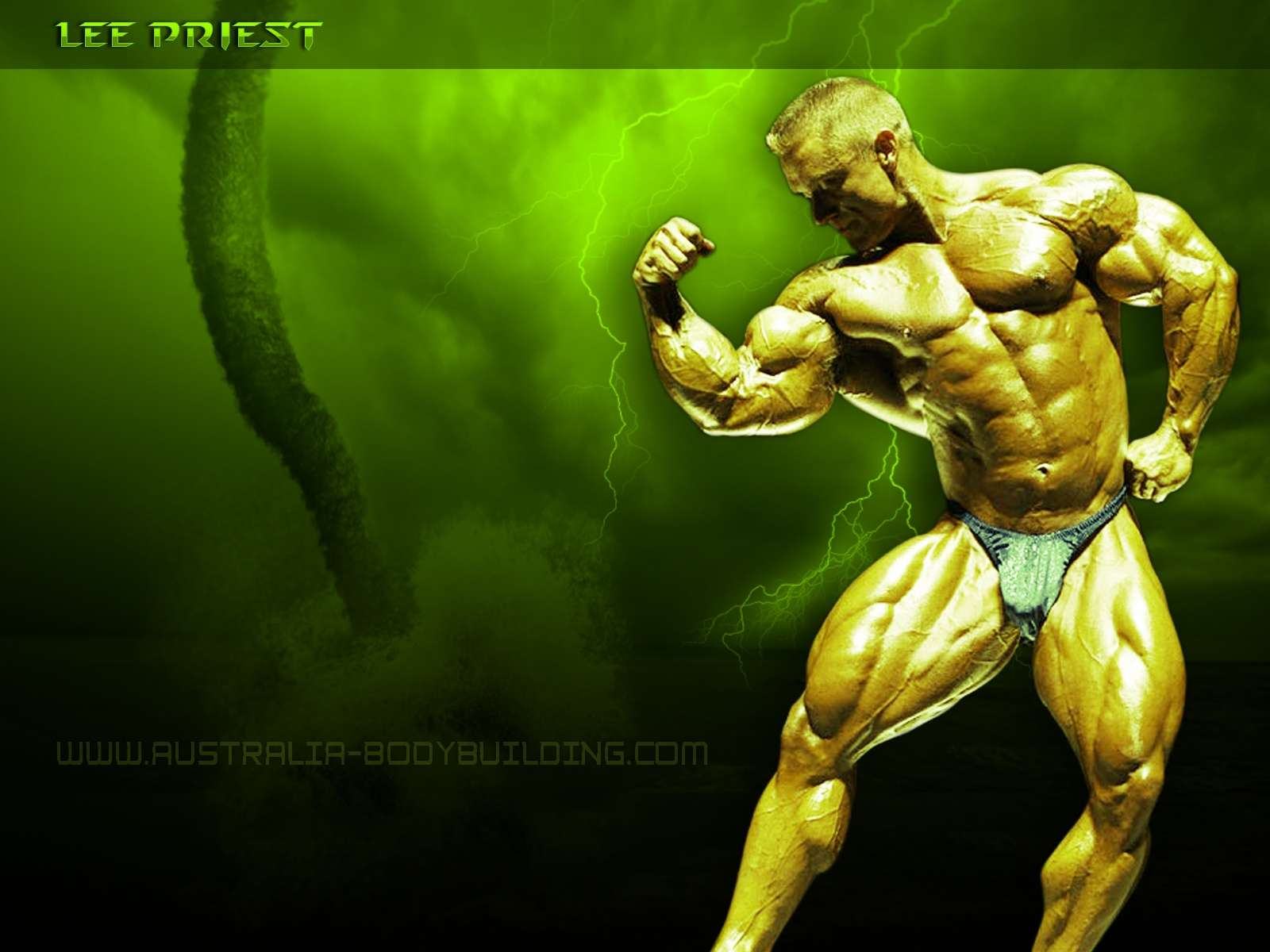 Description: A man with a muscular body and a lightning background is posing for a picture in a green light with a lightning bolt.