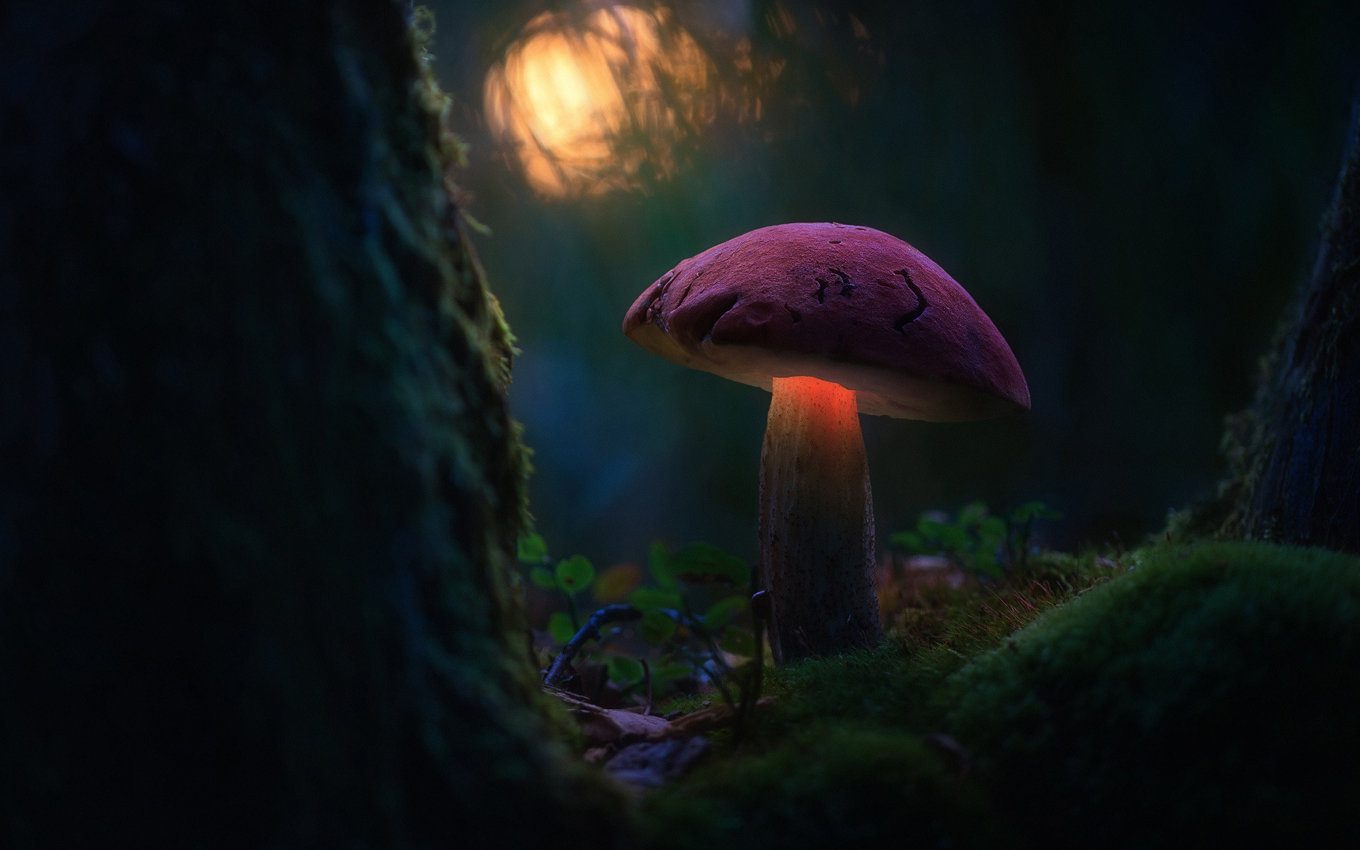 Description: A mushroom with a light on in the forest at night time with a full moon in the background and a tree trunk in the foreground.