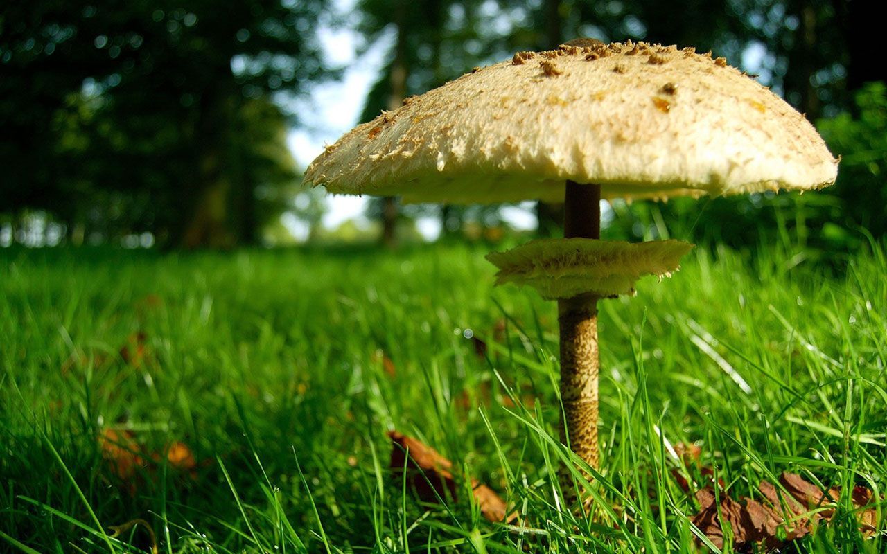 Description: A mushroom sitting on top of a lush green field of grass next to trees and leaves on a sunny day.