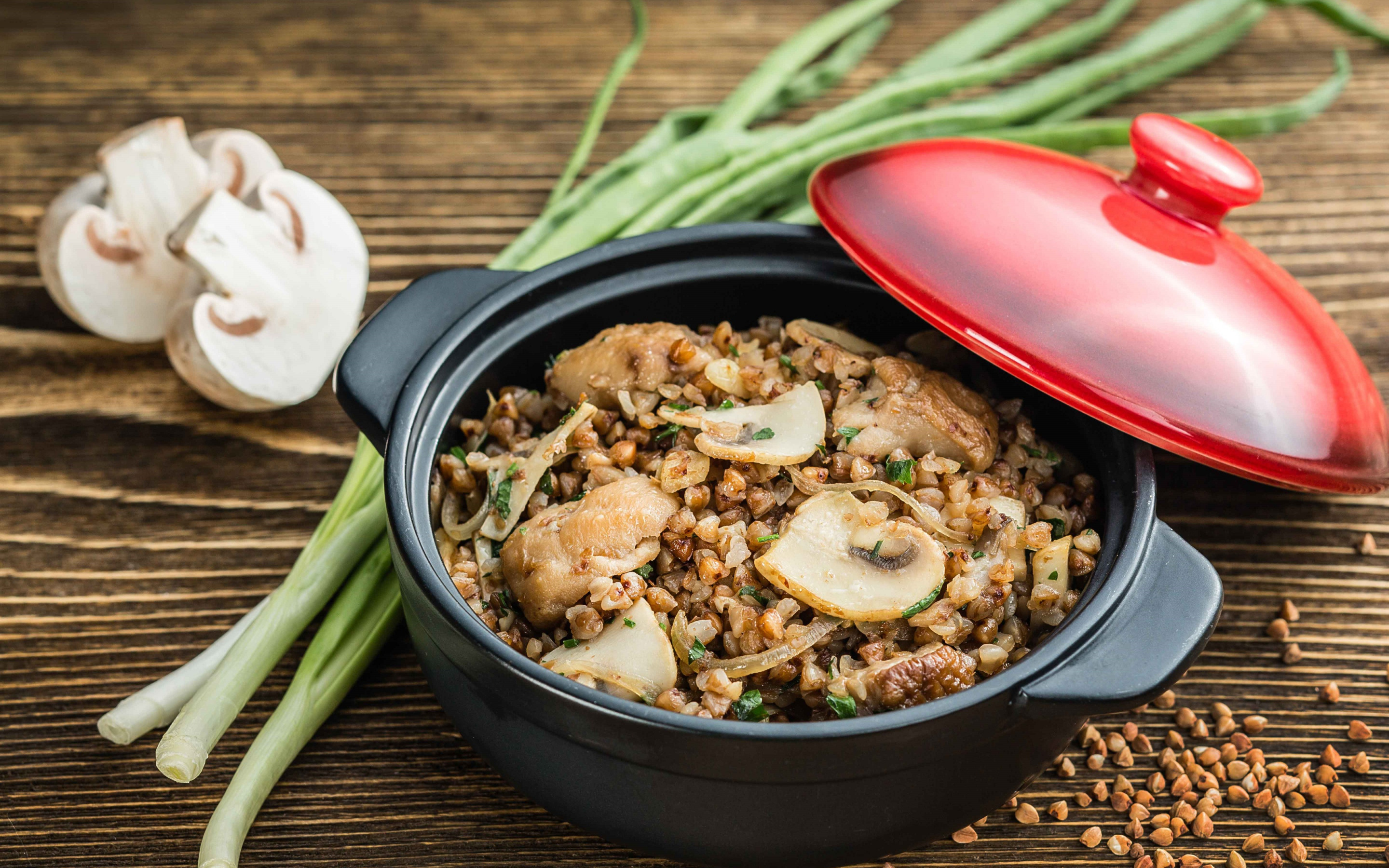 Description: A bowl of food with mushrooms and onions on a table next to garlic and green beans on a wooden table.