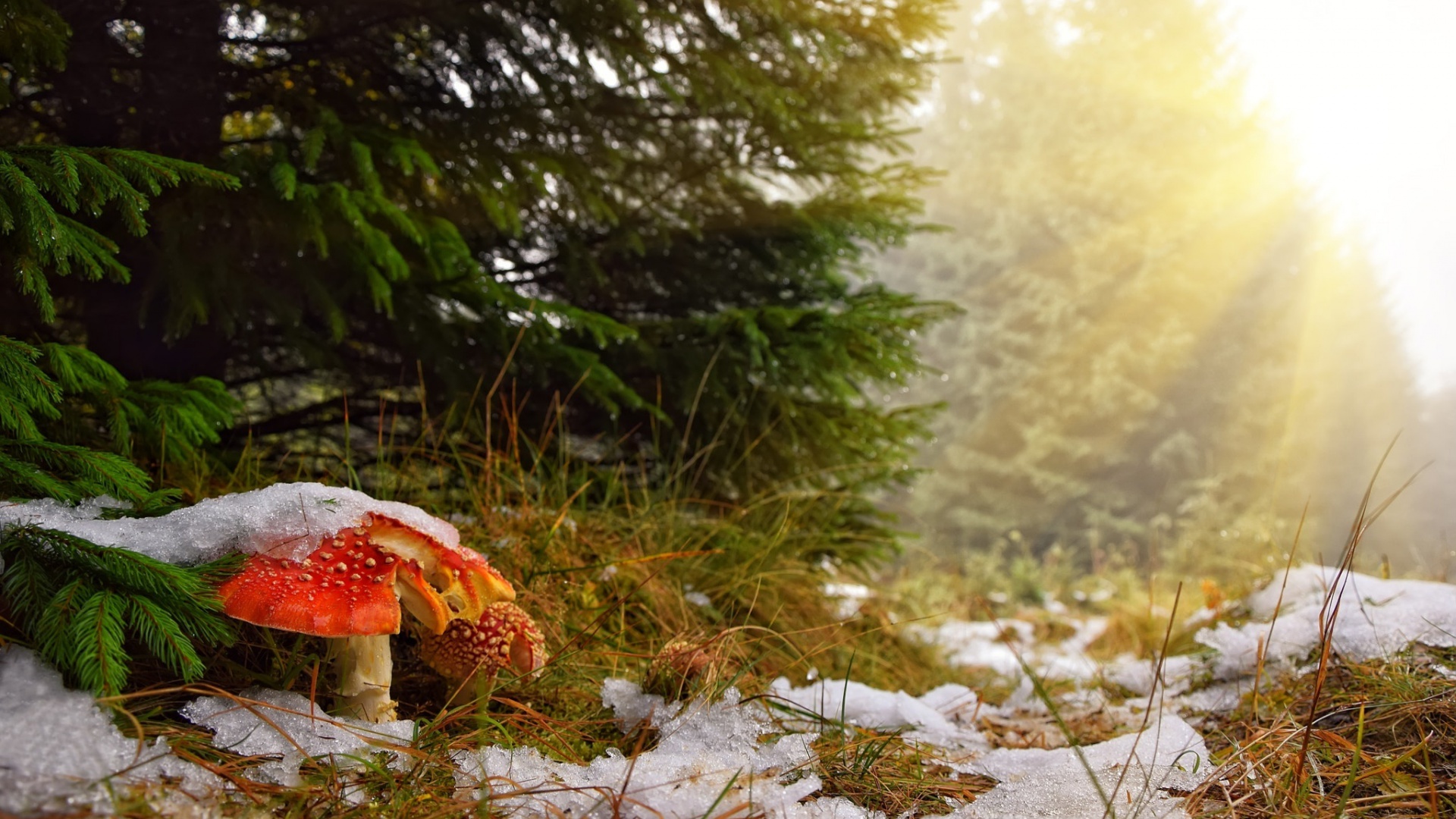Description: A mushroom in the snow near some trees and snow covered ground with sun shining through the trees behind it.