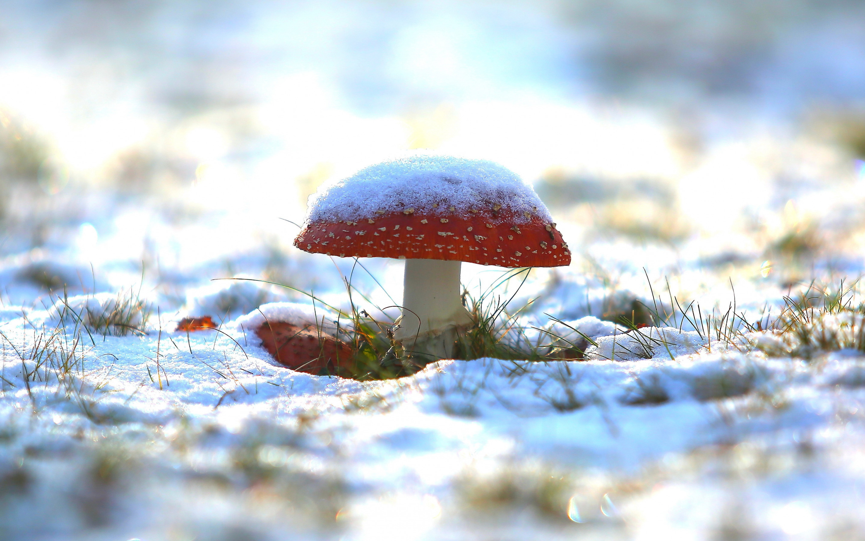 Description: A mushroom is covered in snow on a sunny day in the wintertime.