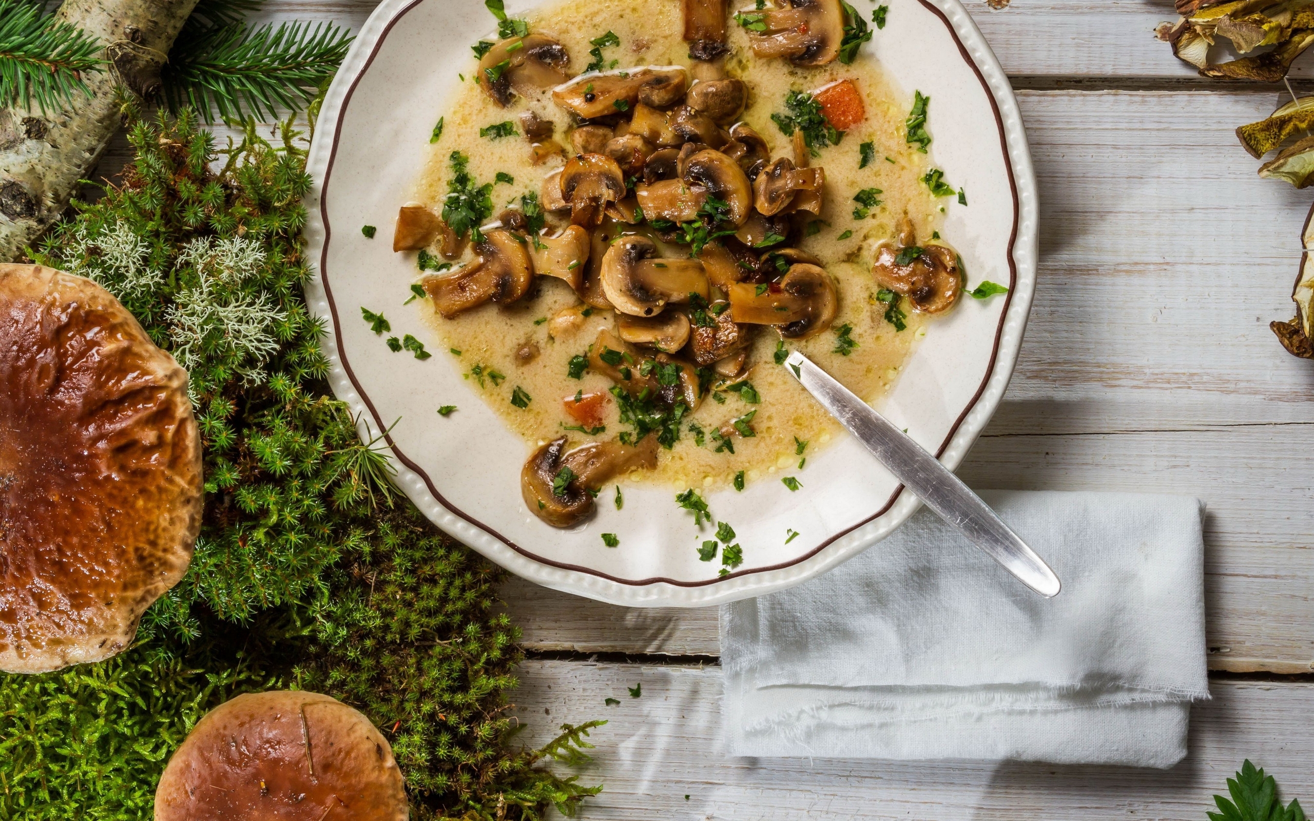 Description: A bowl of mushroom soup with a spoon on a table with mushrooms and mushrooms around it.