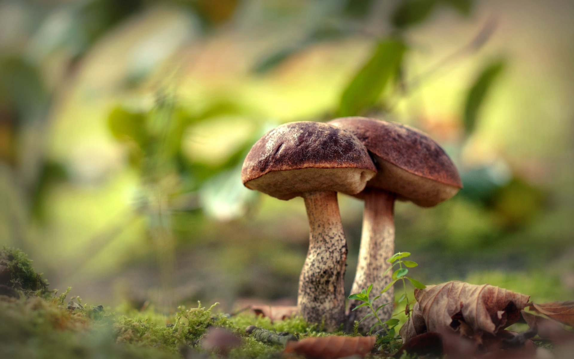Description: A group of mushrooms sitting on top of a lush green field of grass and leaves in the forest.