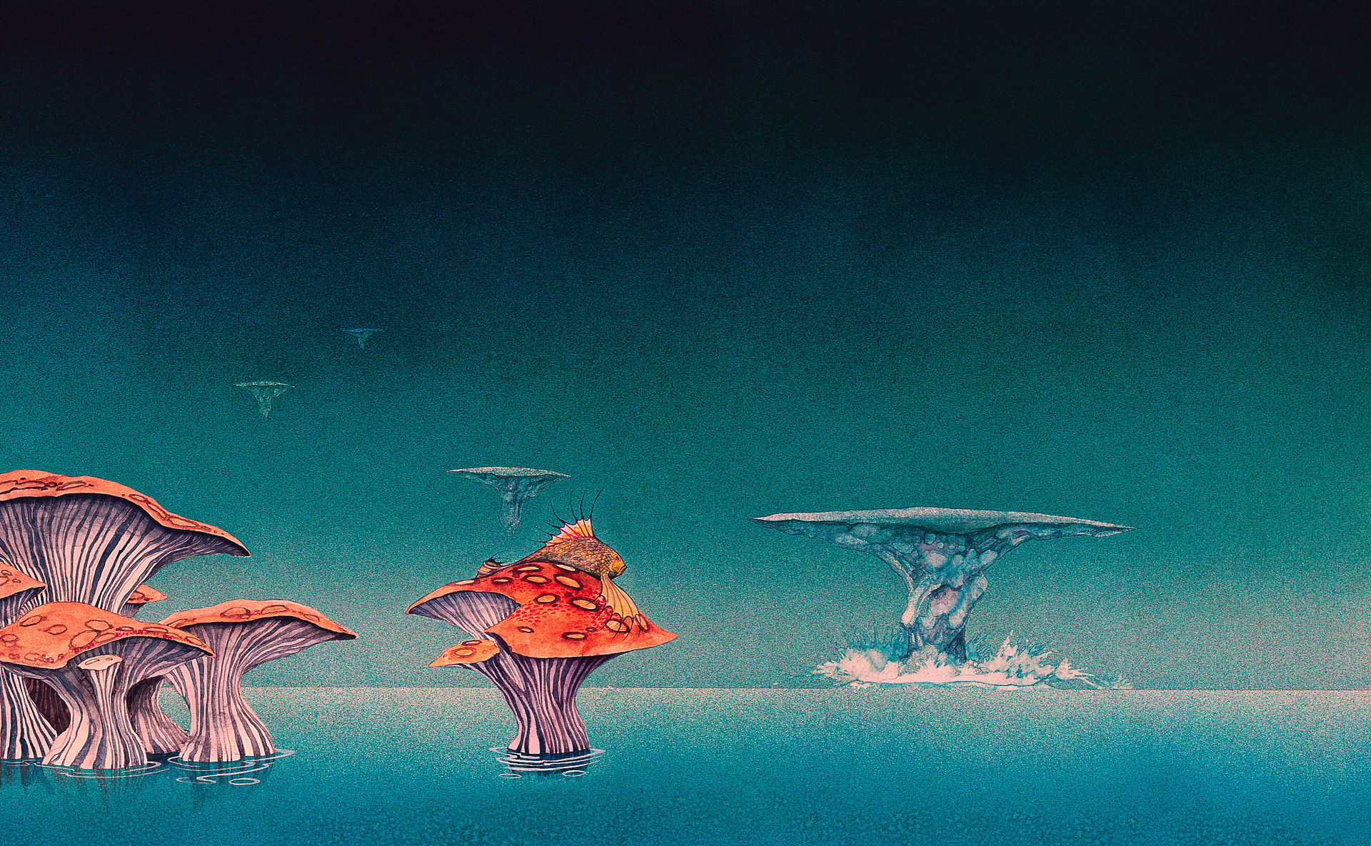 Description: A painting of a group of mushrooms in the water with a mushroom like structure in the background and a mushroom like structure in the foreground.