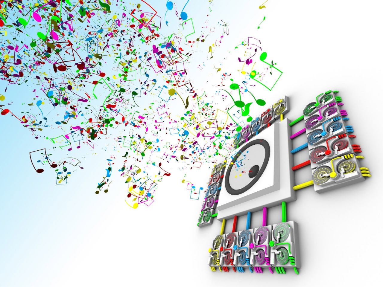 Description: A music note and a sound board with colorful notes coming out of it and a blue sky in the background.