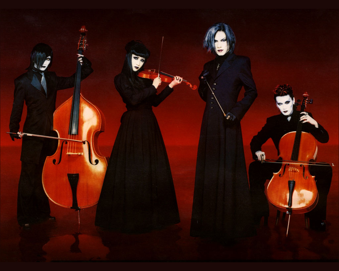 Description: A group of people with musical instruments in their hands and a red background with a black background and a red background.