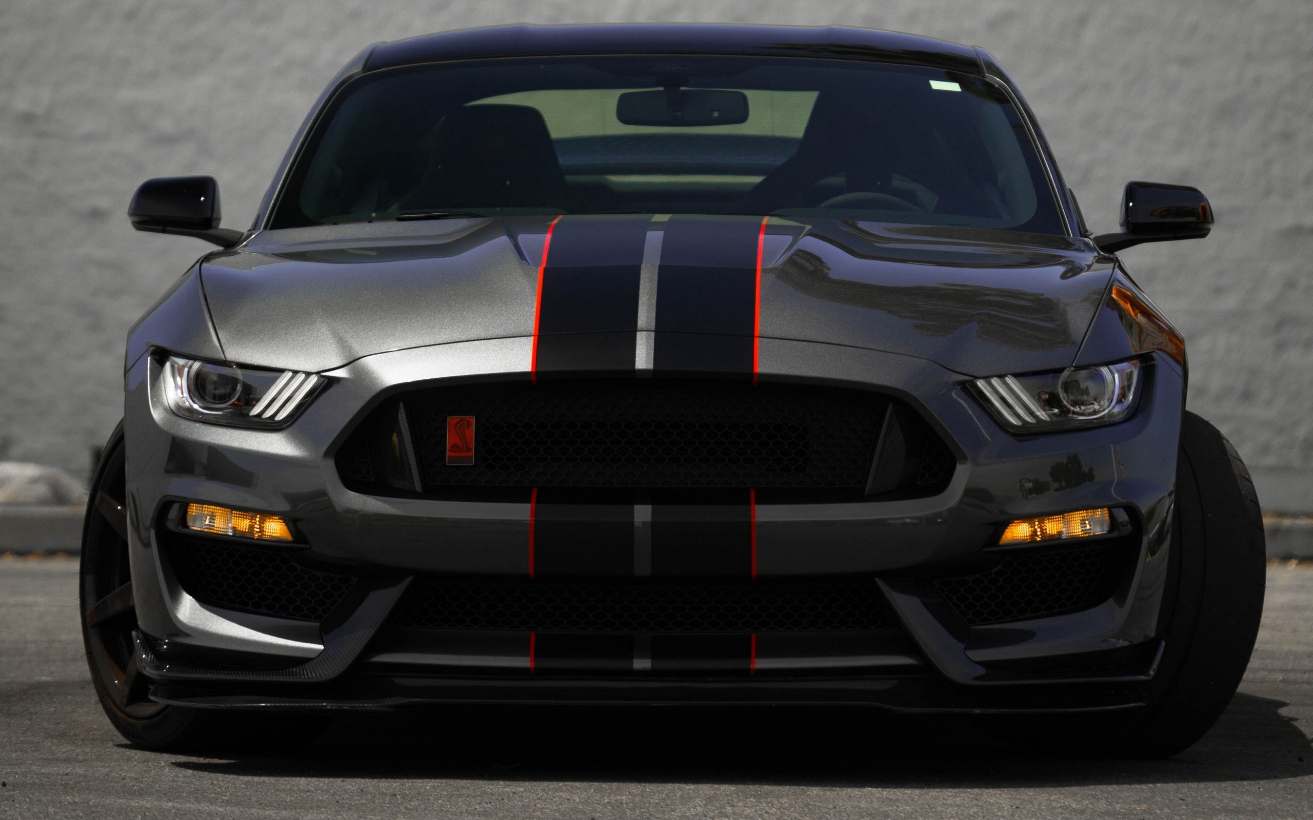 Description: A mustang mustang with a red stripe on the front of it's hood and hood scoops is shown.