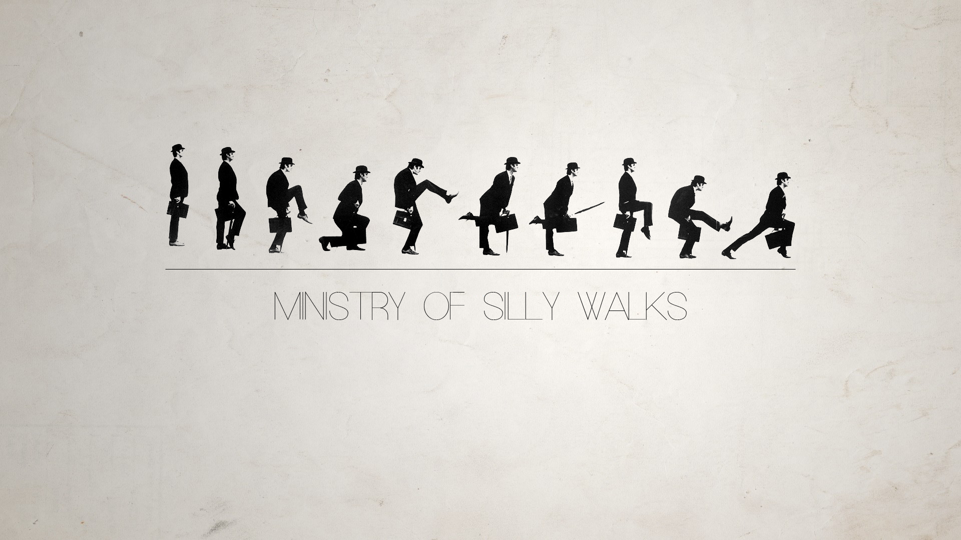 Description: A group of people walking across a white wall with the words mystery of silly walks on it's side.