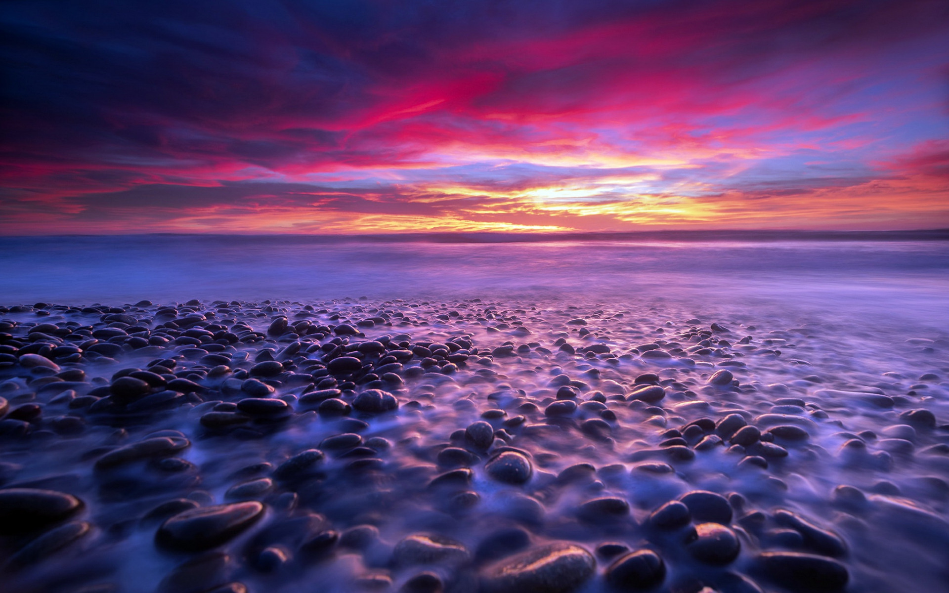 Description: A beach covered in rocks under a colorful sky at sunset with a pink and blue sky above it and a red and purple sky above.