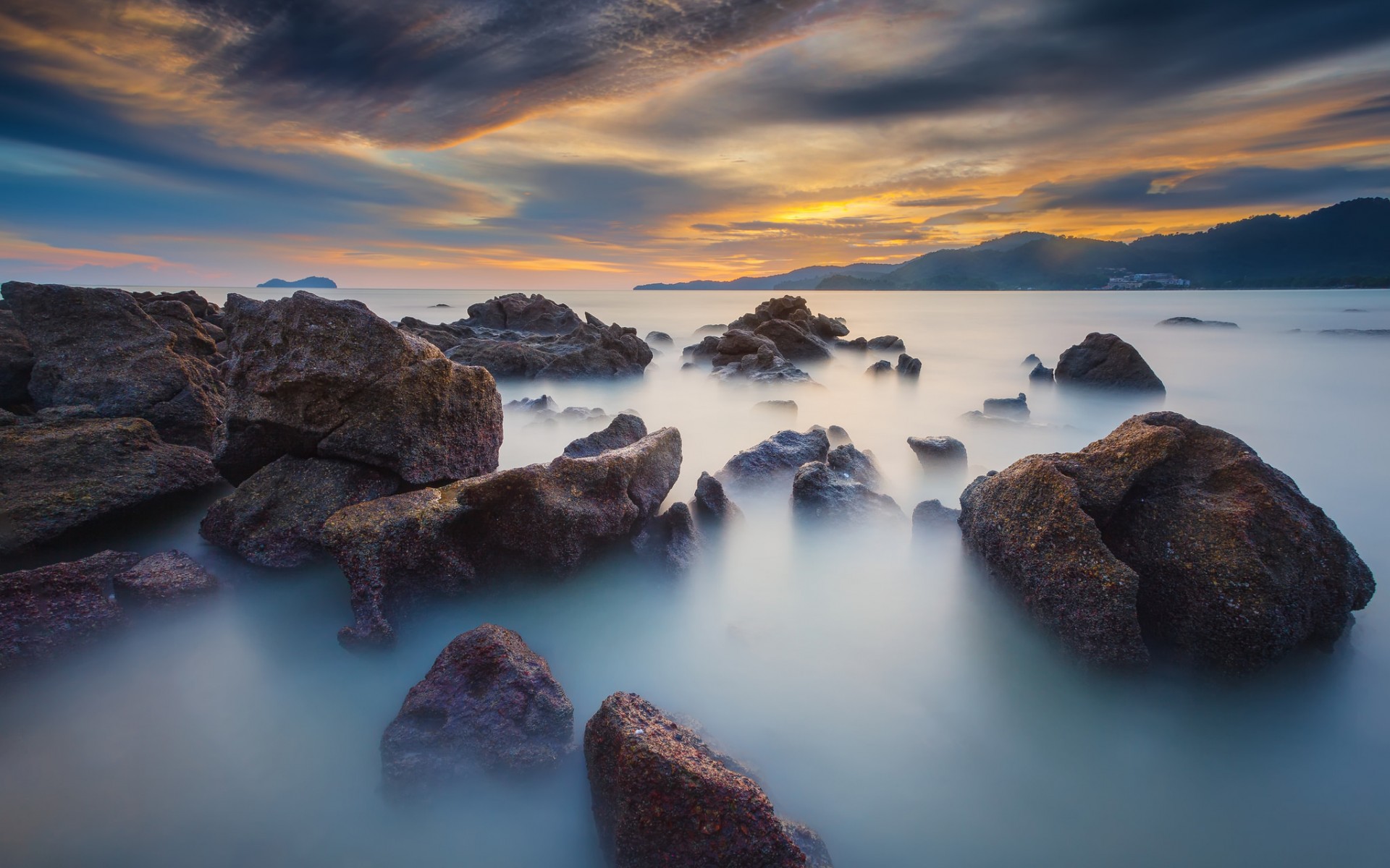 Description: A long exposure of rocks in the water at sunset with a cloudy sky above them and a mountain range in the distance.