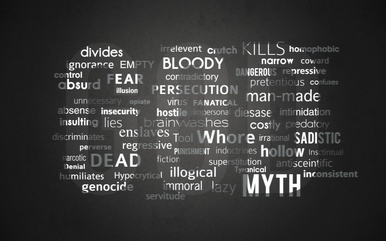 Description: A black and white photo of a word cloud with words related to the word myth on it in a dark room.