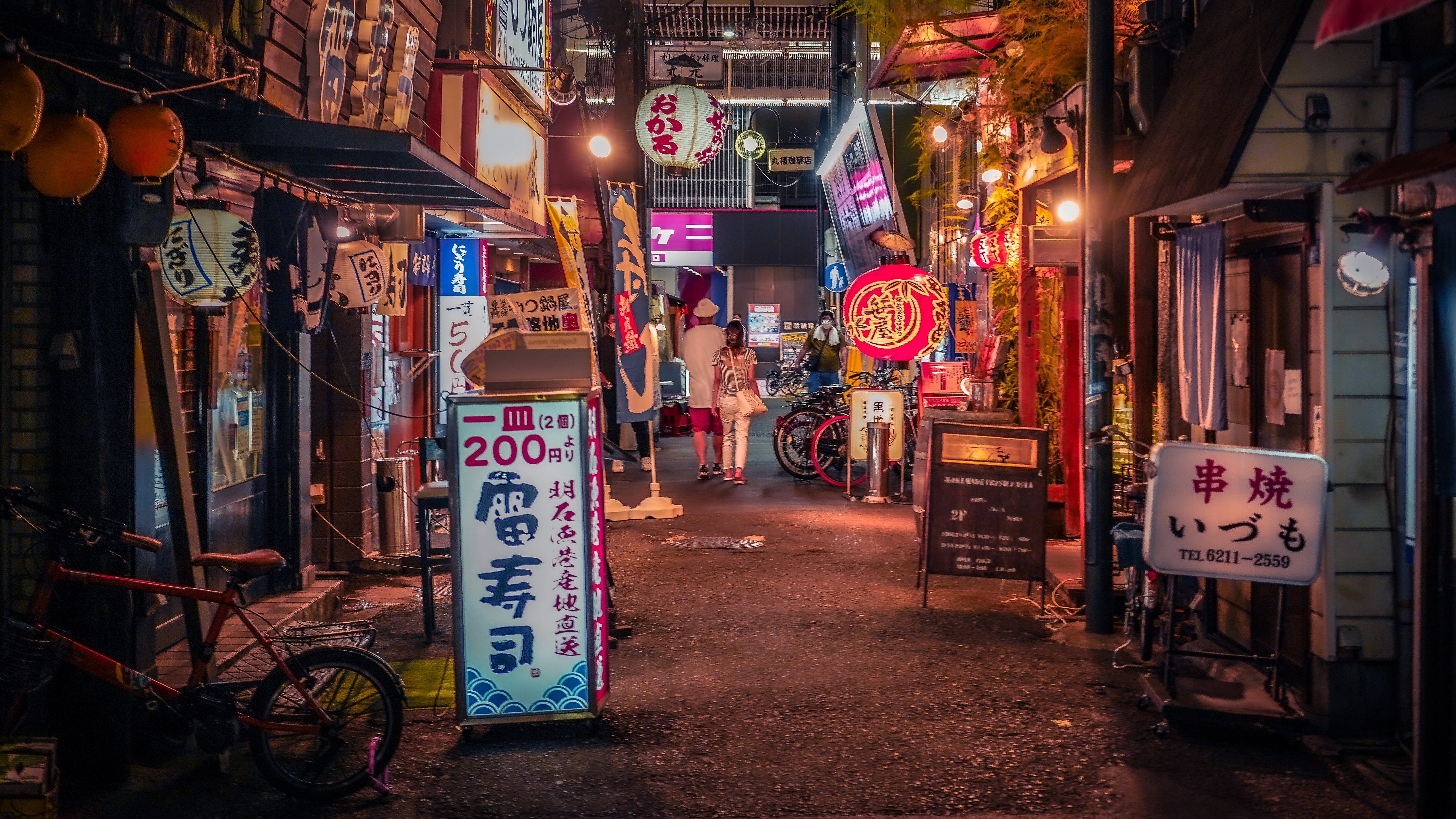 Description: A narrow alley with signs and a bicycle parked on the side of it at night time in a city.