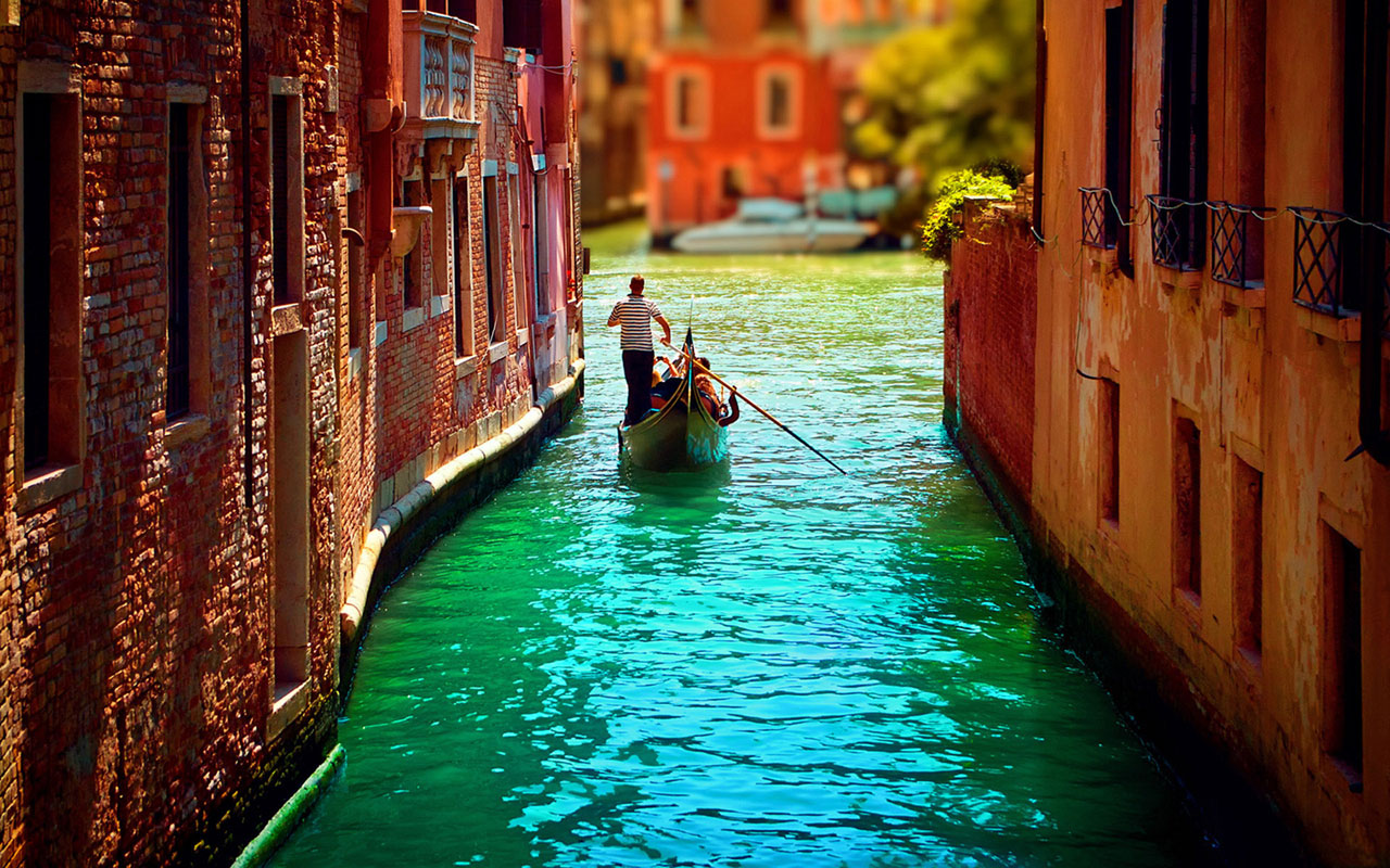 Description: A man riding a boat down a narrow canal next to tall buildings on either side of a river with a man standing on the side.