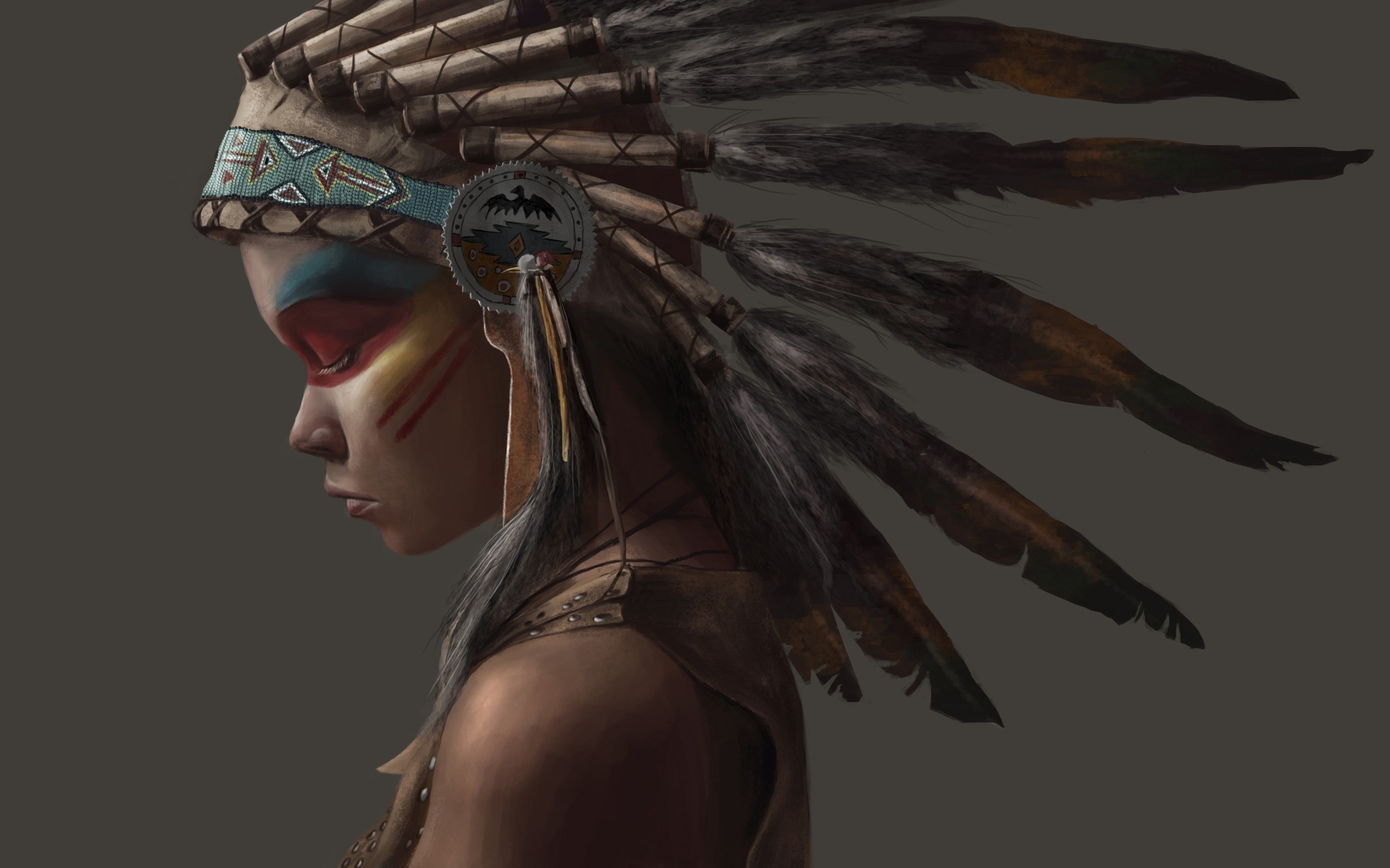 Description: A native american indian woman with feathers on her head and a feathered headdress on her head.