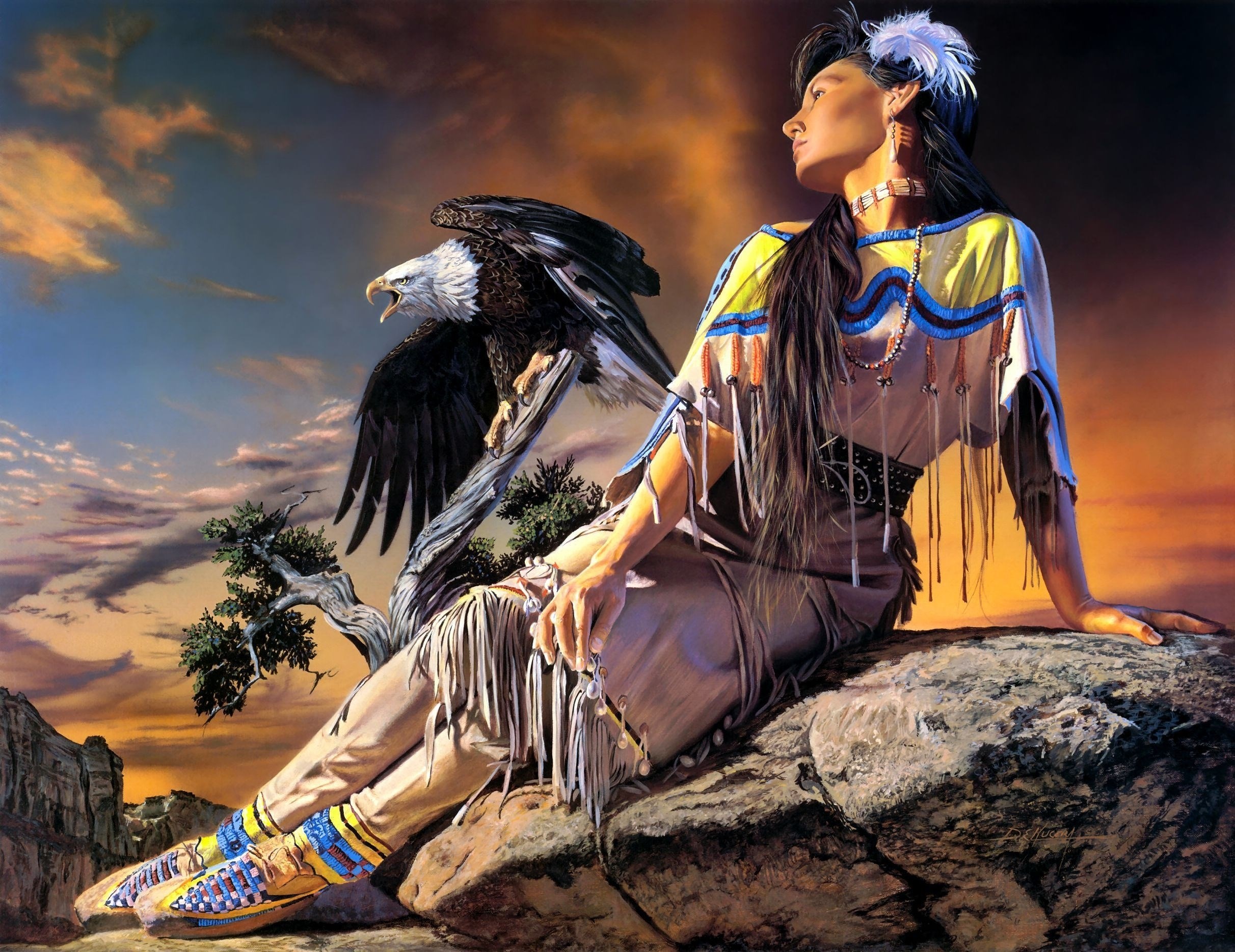 Description: A native american woman sitting on a rock with a bird on her lap and a sunset in the background.