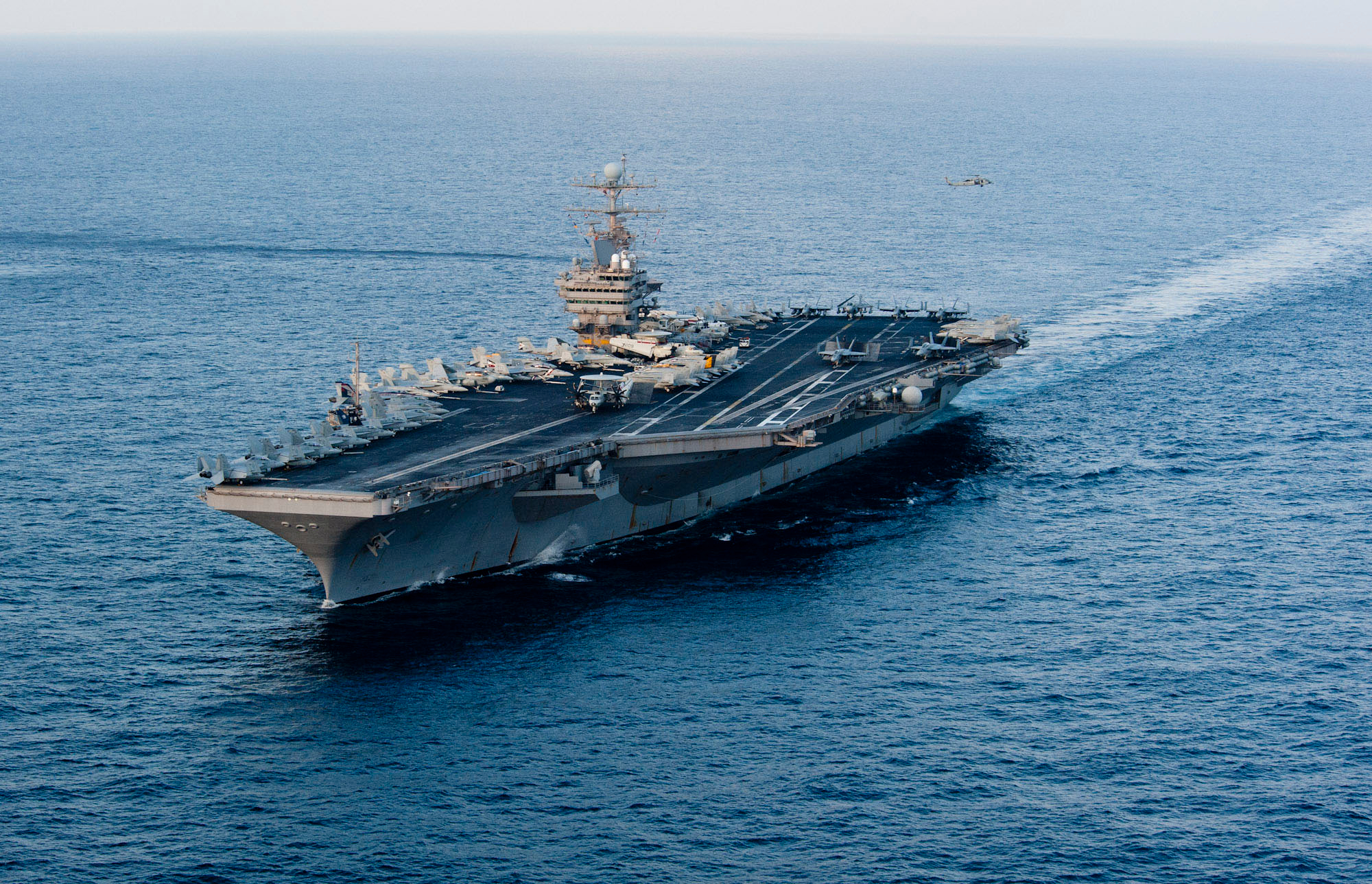 Description: A large navy ship sailing across the ocean with a jet boat in the background and a helicopter flying overhead.