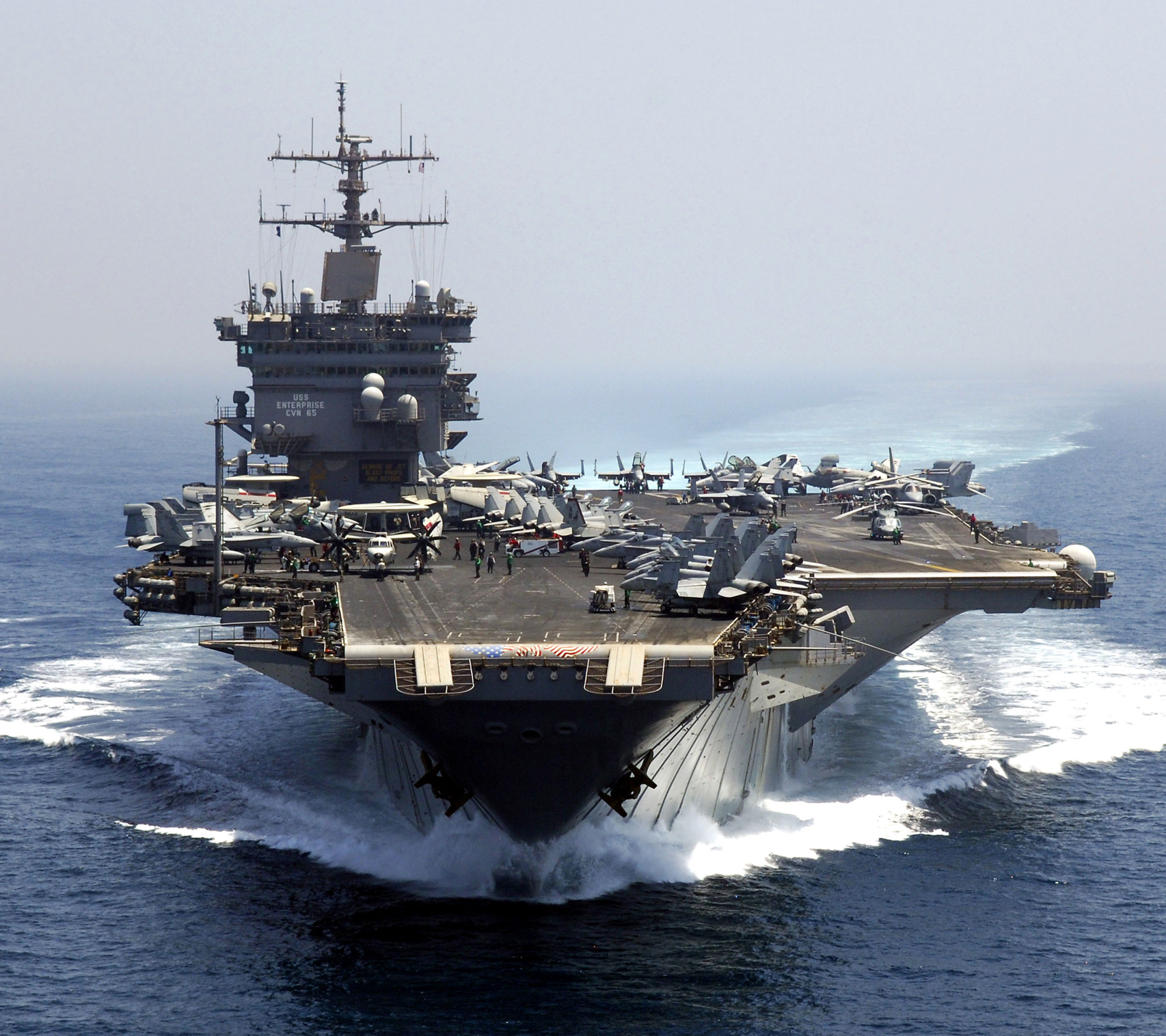 Description: A large navy ship sailing across the ocean with other ships in the background on a sunny day with a few clouds.