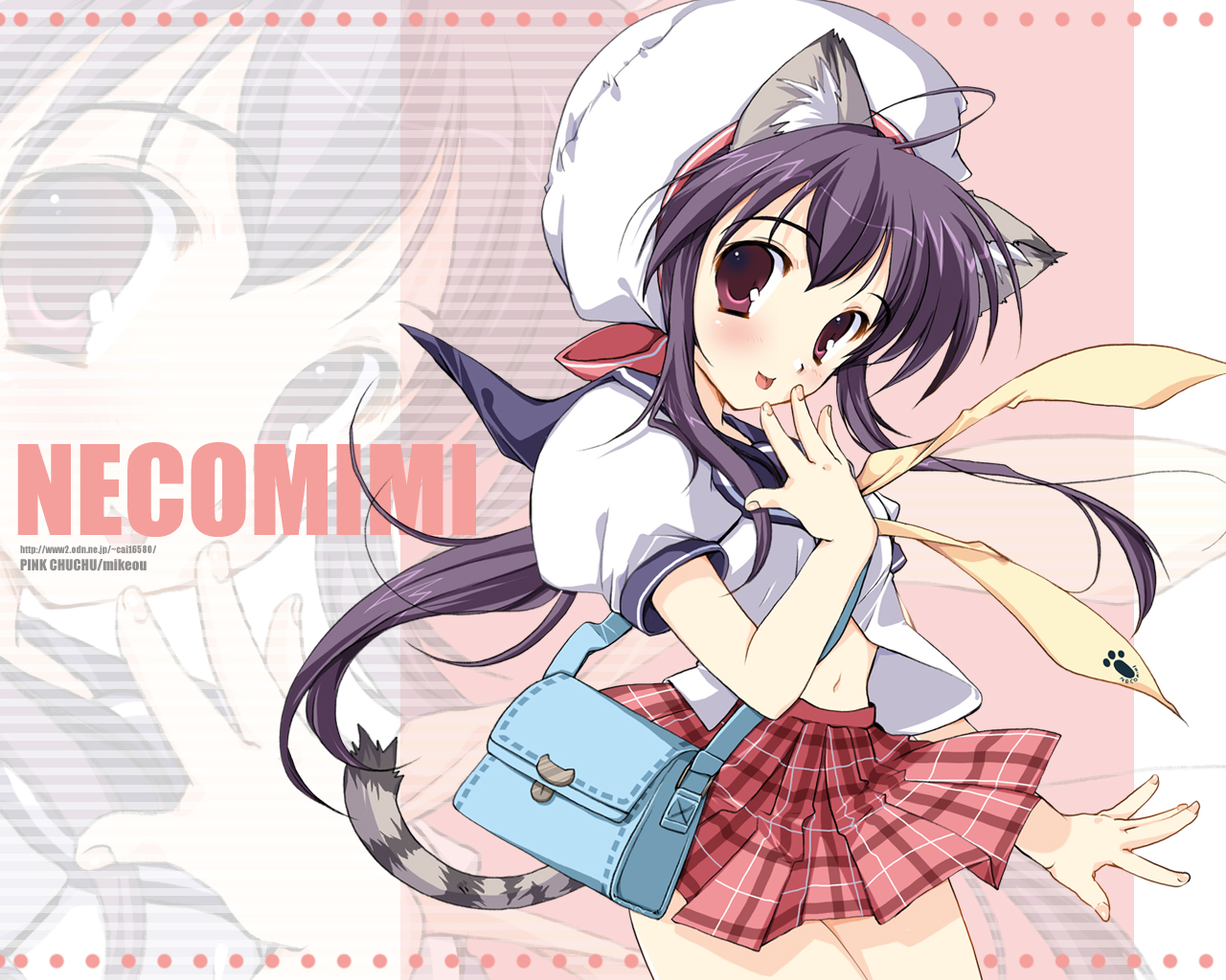 Description: A girl in a sailor outfit holding a blue purse and a cat on her shoulder.
