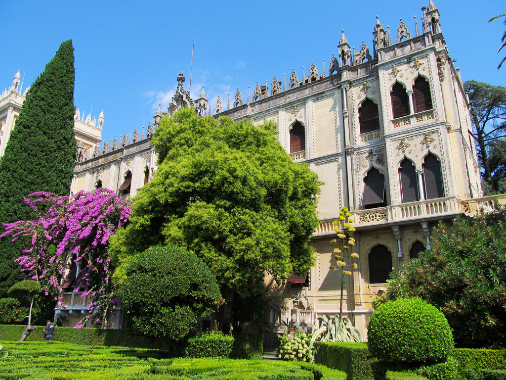 Description: A large building with a garden in front of it and a tree in the middle of the yard with a lot of bushes.