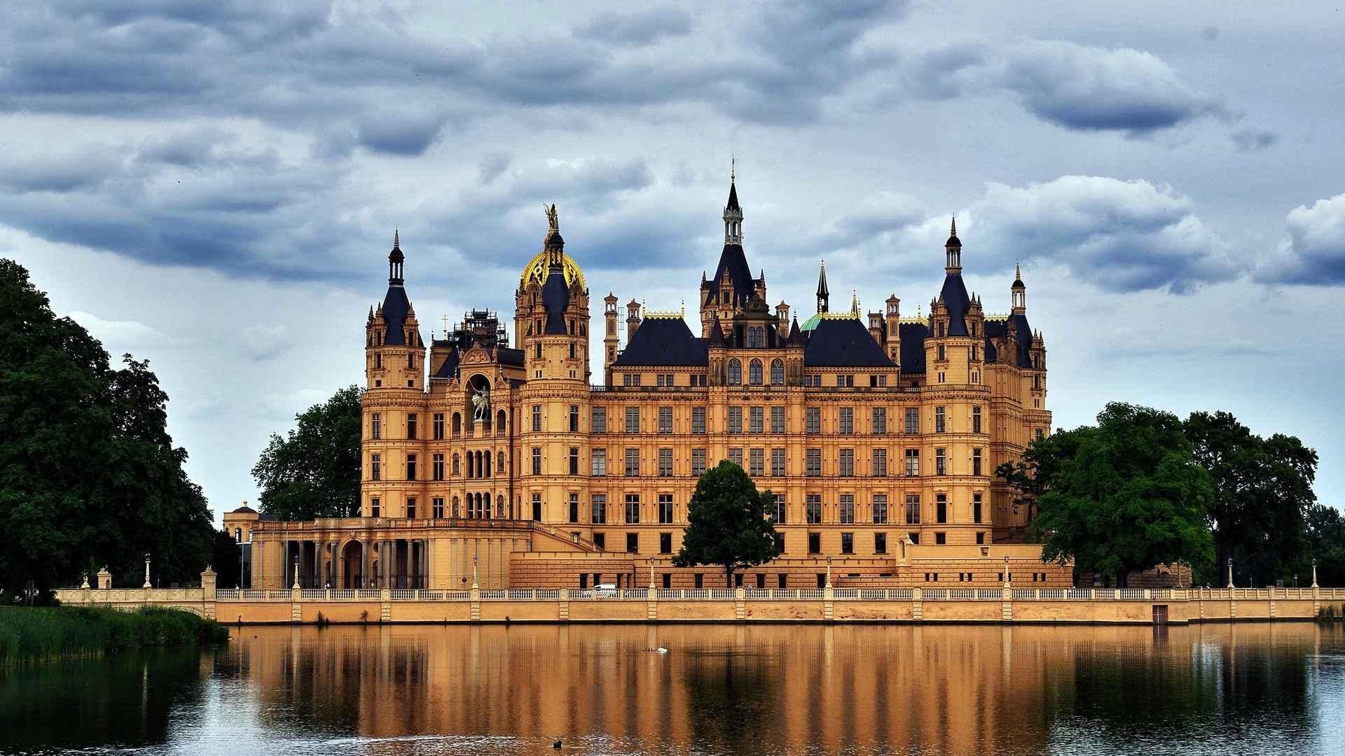 Description: A large building with towers and towers on top of it near water and trees in front of it.