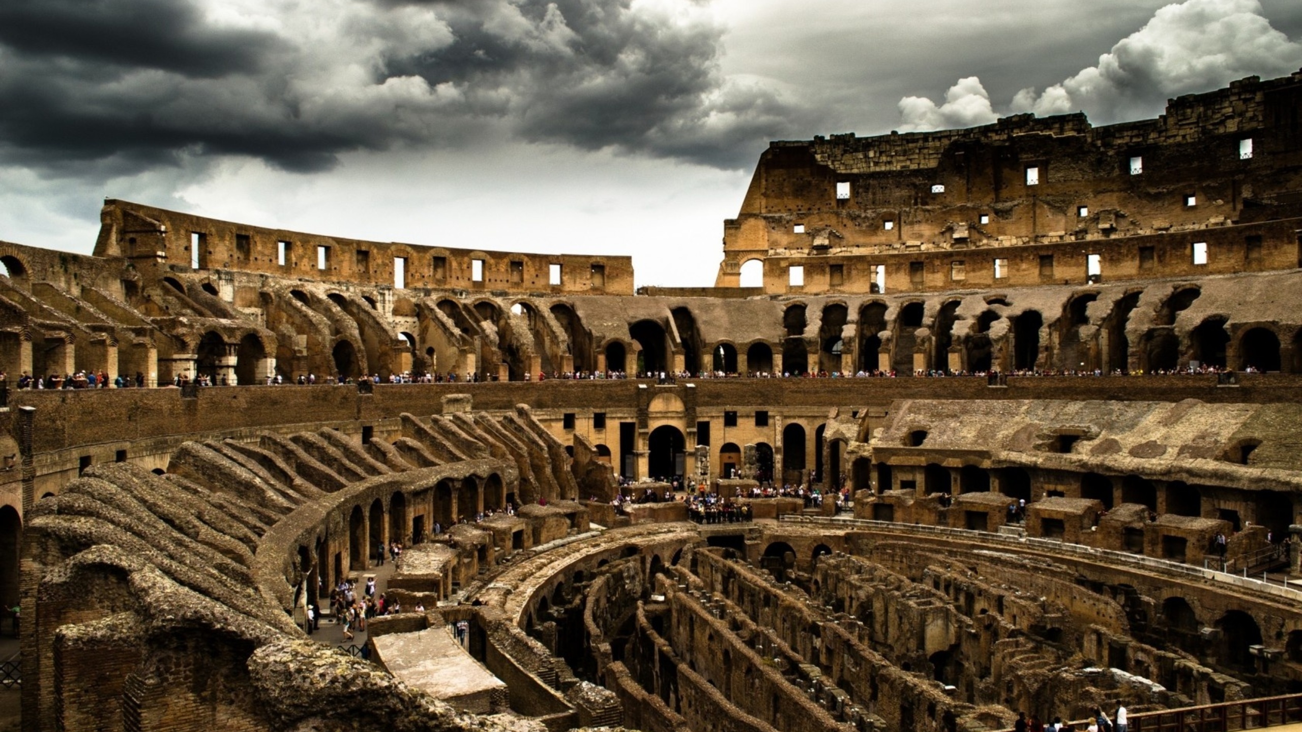 Description: A large building with a bunch of people inside of it with a cloudy sky above it and a few people standing around.