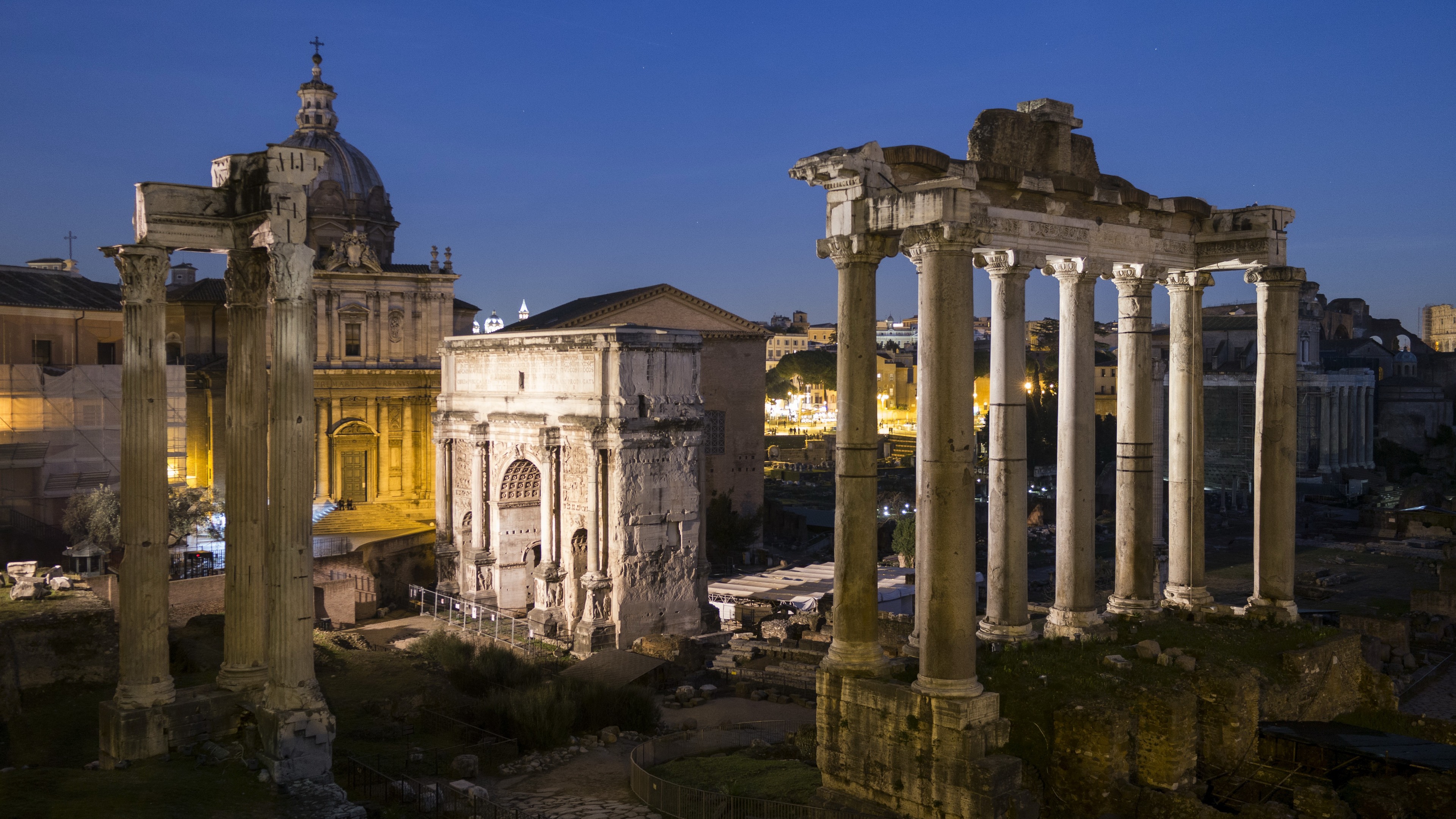 Description: A large building with columns and a clock tower in the background at night time with lights on and a few buildings in the foreground.
