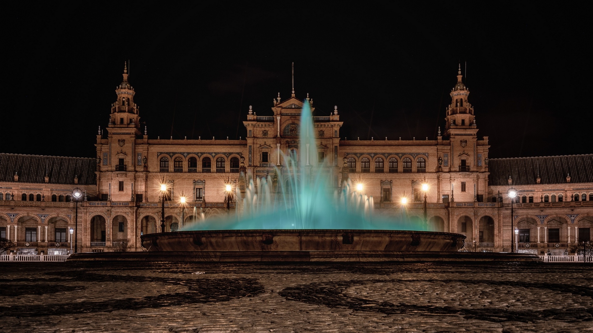 Description: A large building with a fountain in front of it at night time with lights on the building and a clock tower.