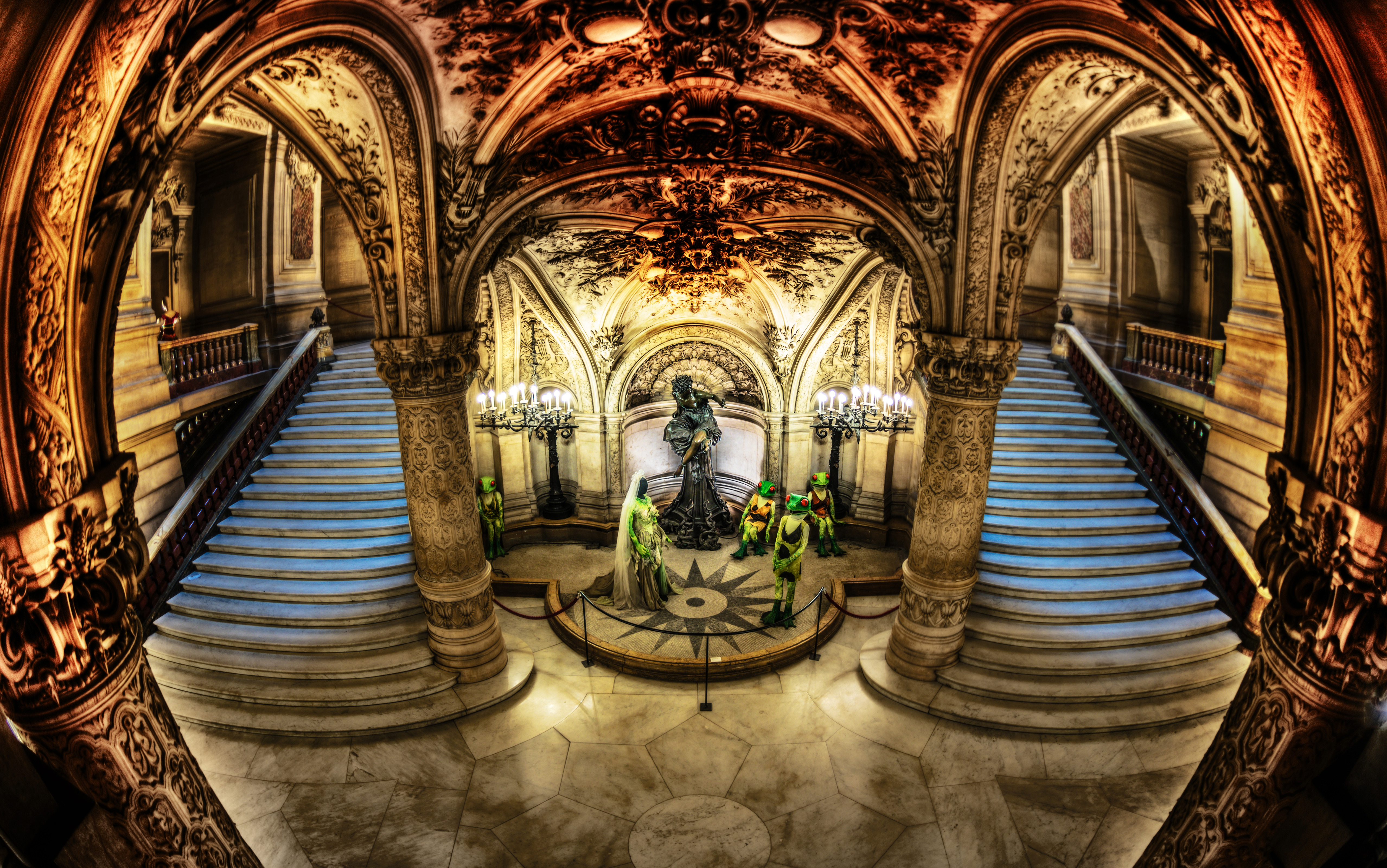 Description: A large building with a staircase and a clock on the wall and a statue in the middle of the hall.