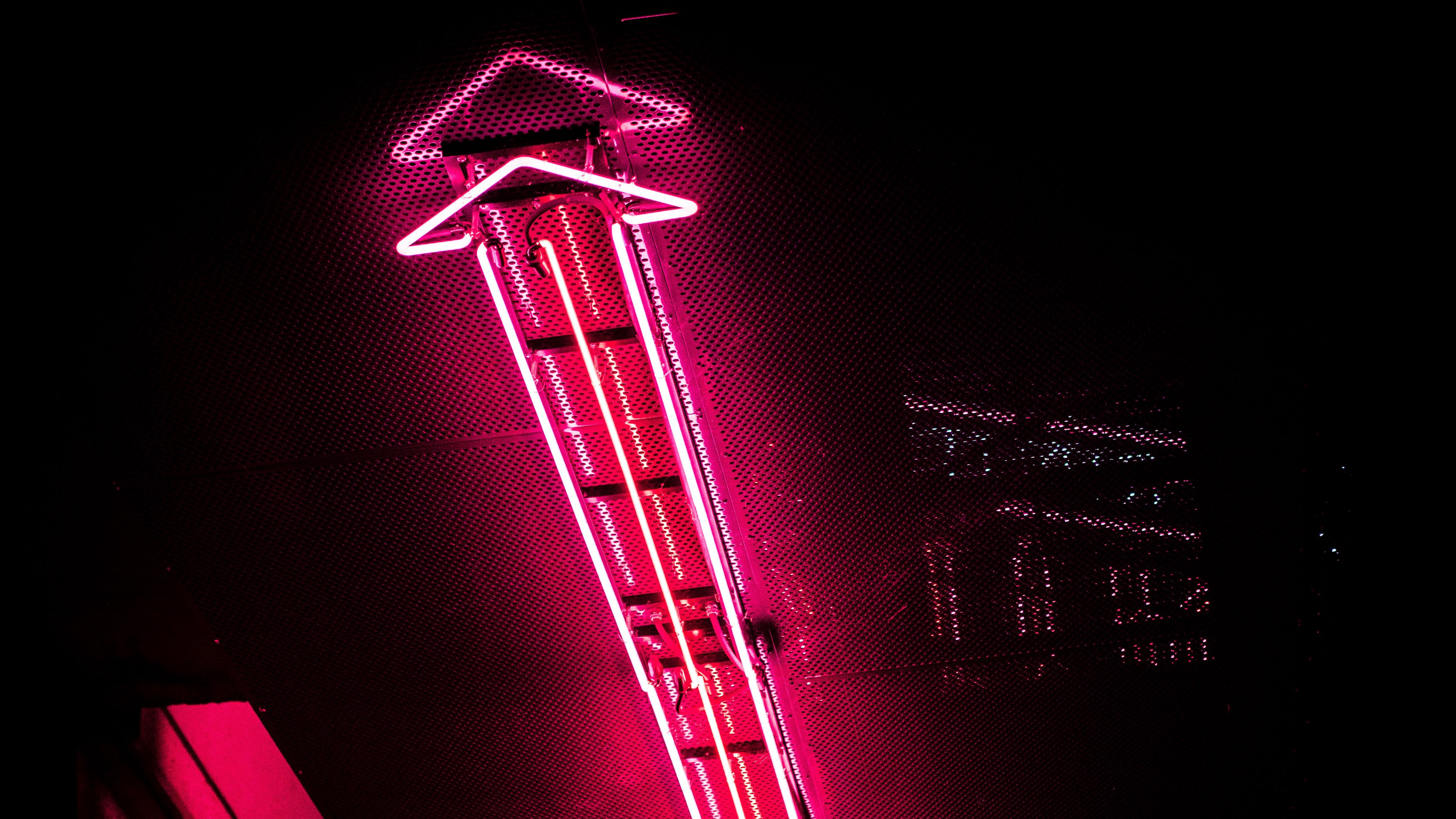 Description: A neon sign with a building in the background at night time with a red light on it's side.