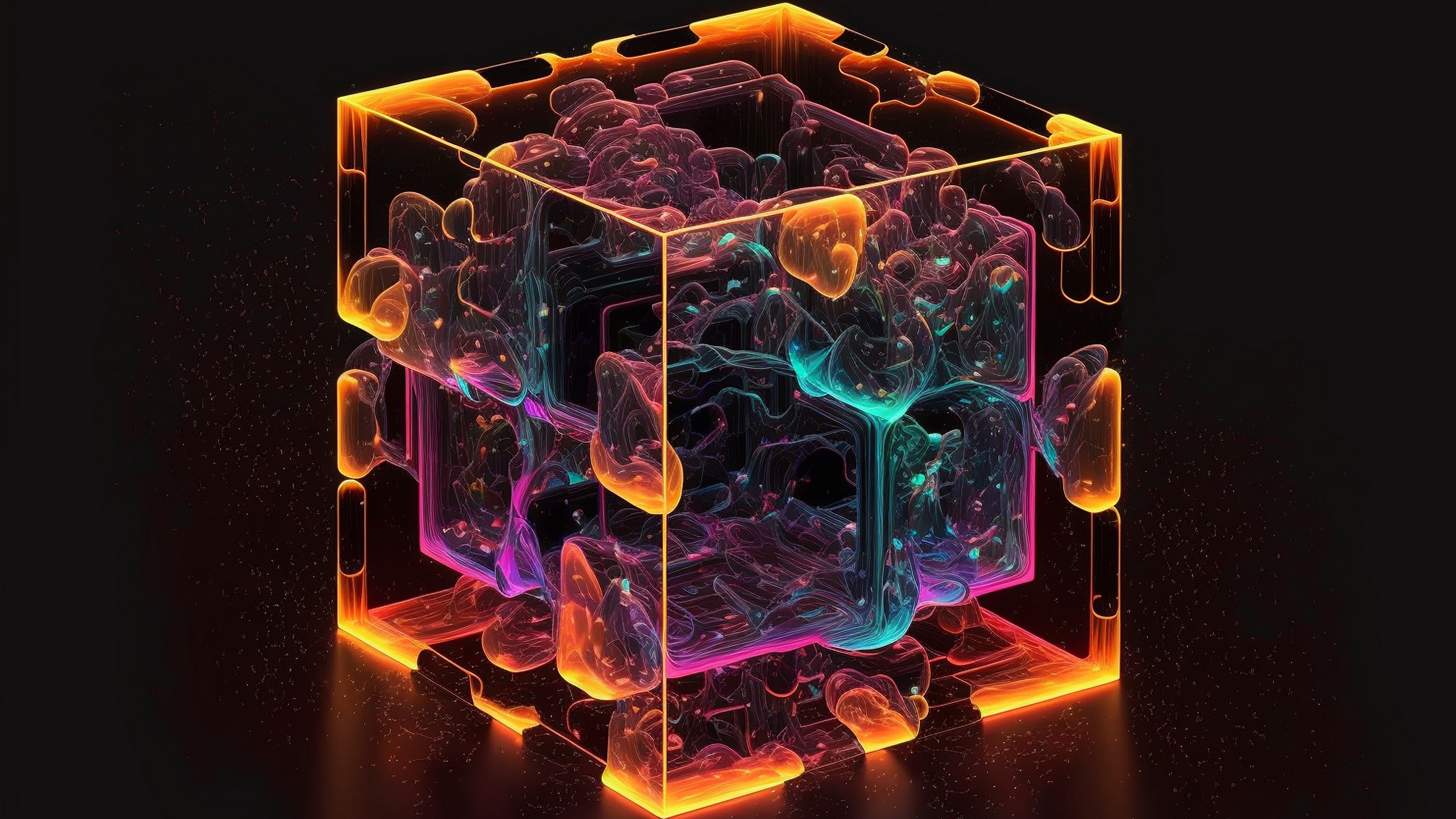 Description: A cube with neon lights and bubbles inside it on a black background with a black background and a black background.