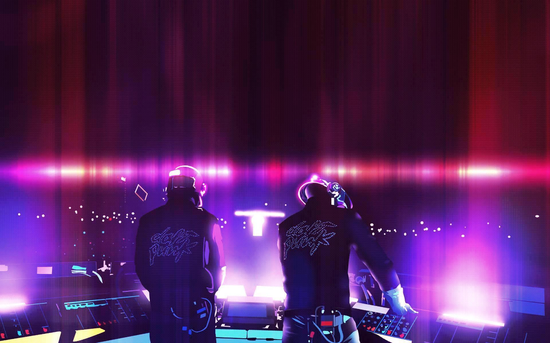 Description: Two people in black shirts standing in front of a computer screen with a neon background and a red and purple light.