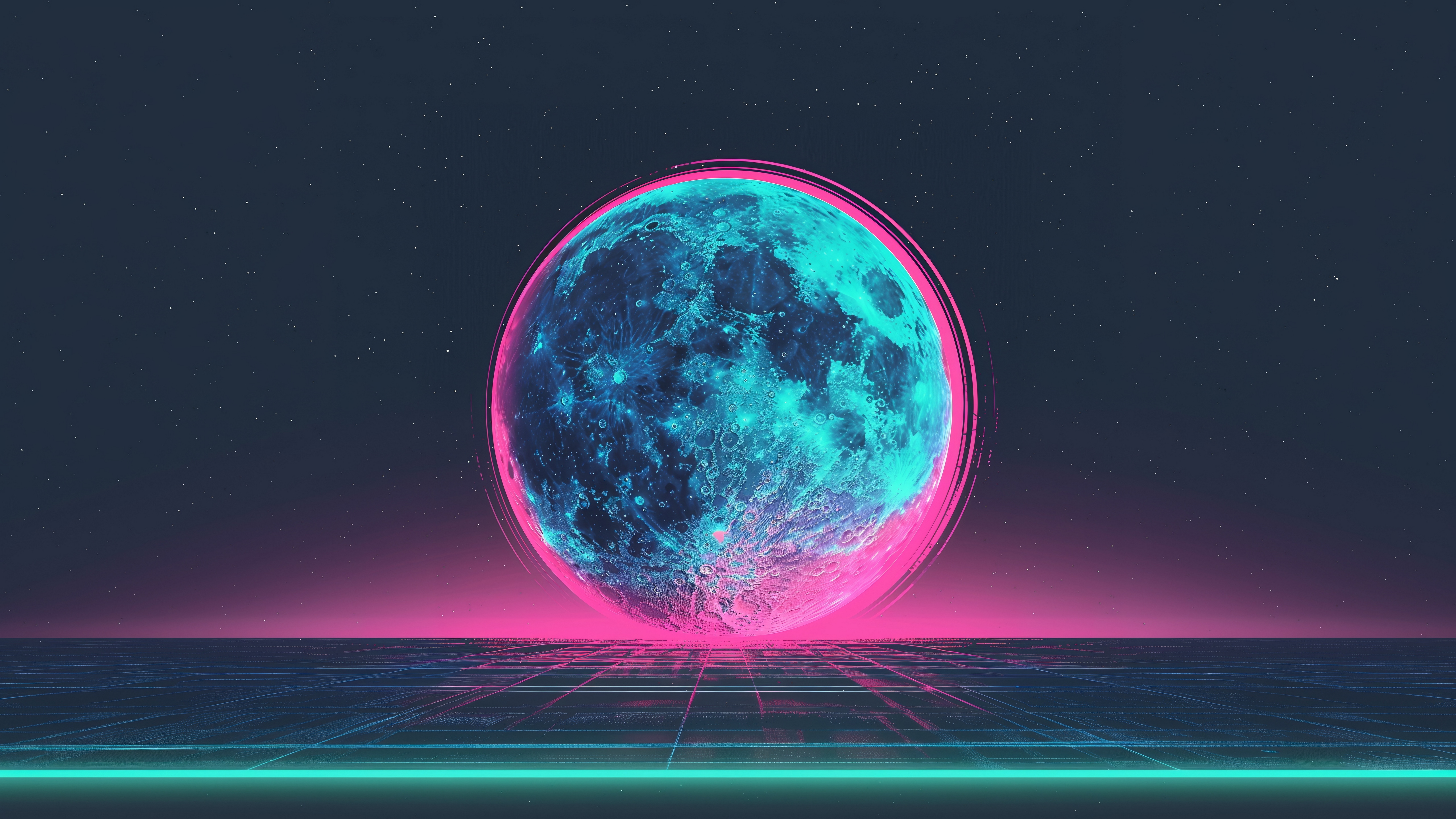 Description: A blue and pink sphere with a neon glow on it's surface in the middle of a dark room.