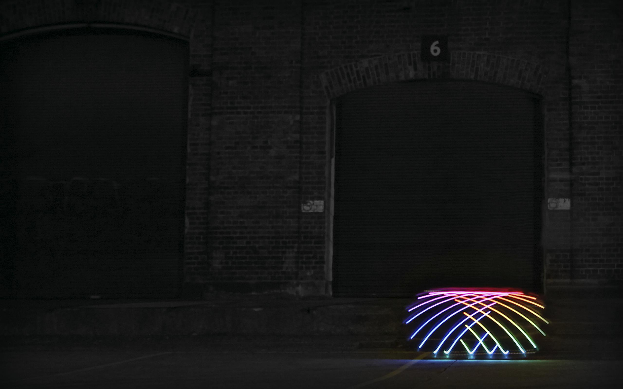 Description: A neon light is shining on a dark street in front of a brick building with a doorway and a doorway.