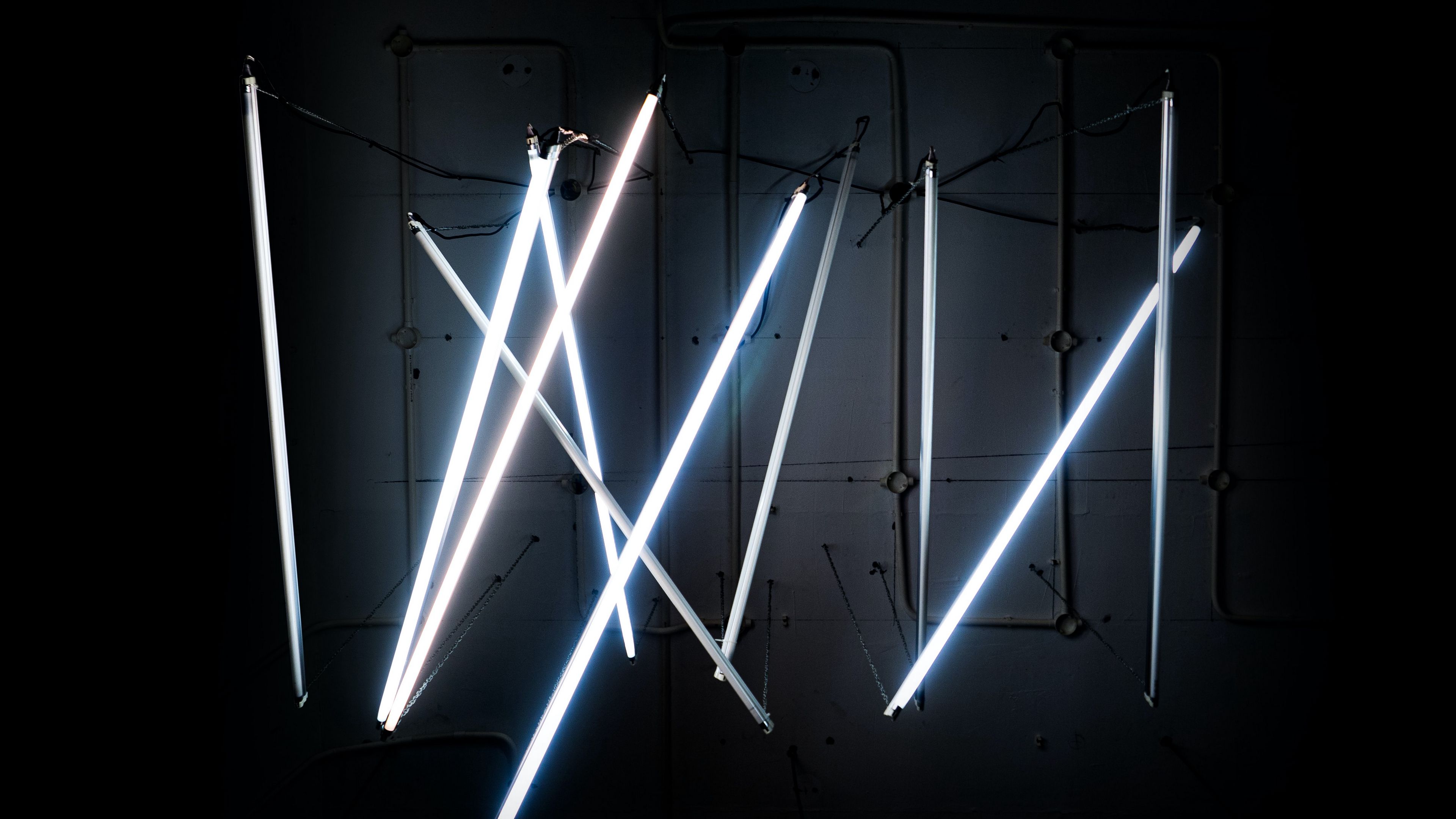 Description: A group of lights that are on a wall in the dark with a black background and a black wall.
