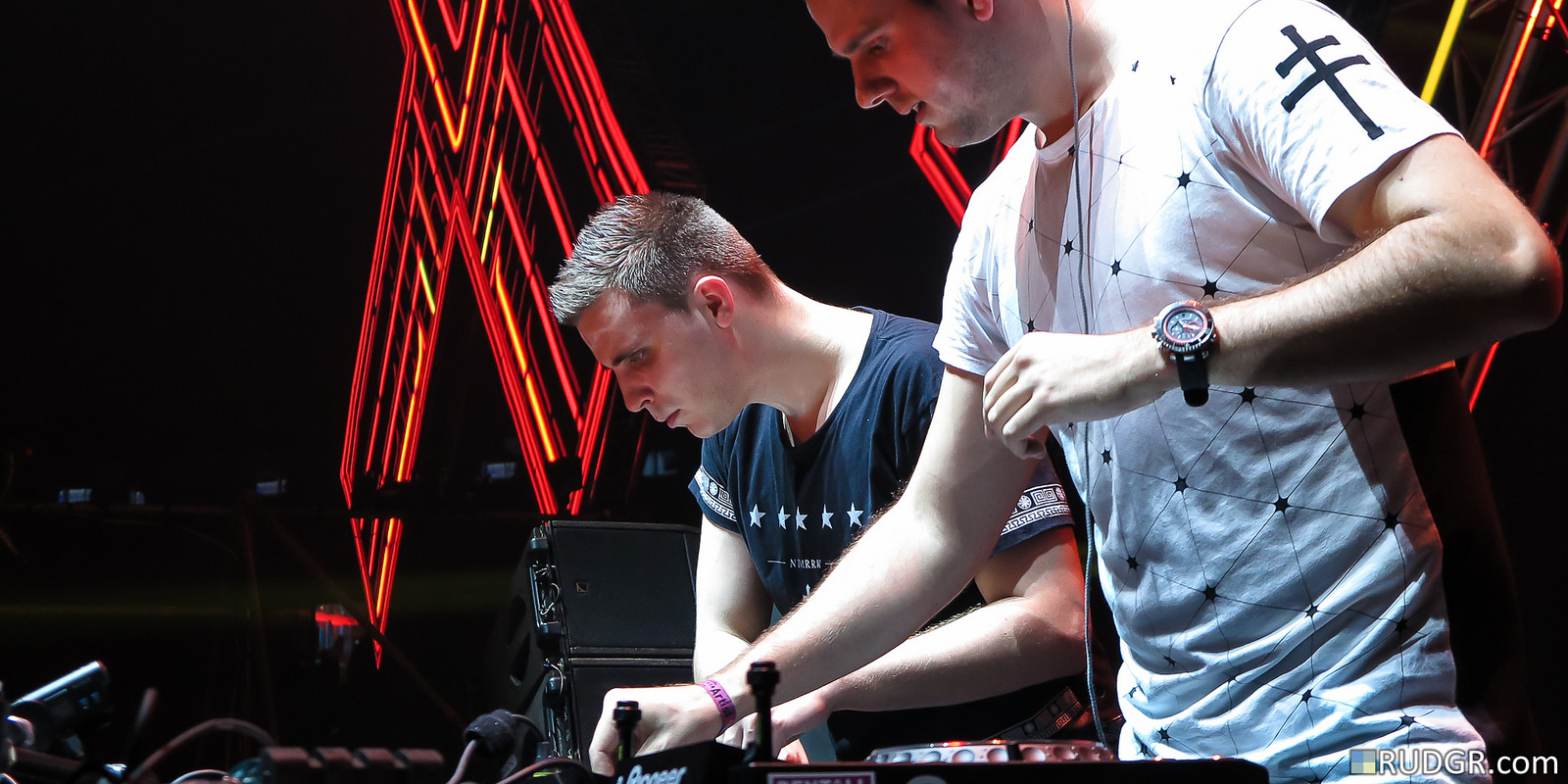 Description: Two men are working on a project together at a concert with neon lights behind them and a black background.