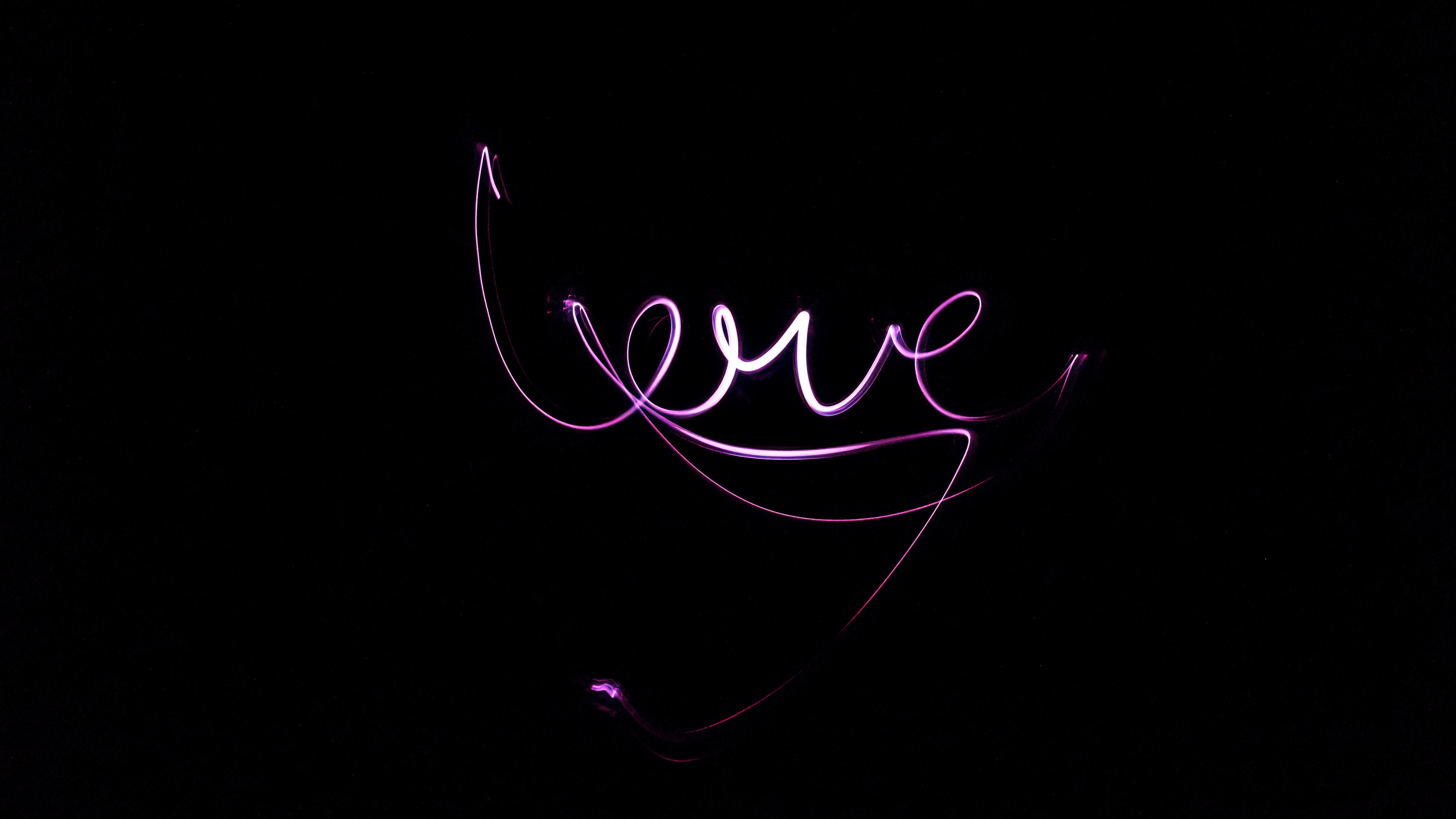 Description: A neon sign that says love in the dark sky with a black background and a purple light in the middle.