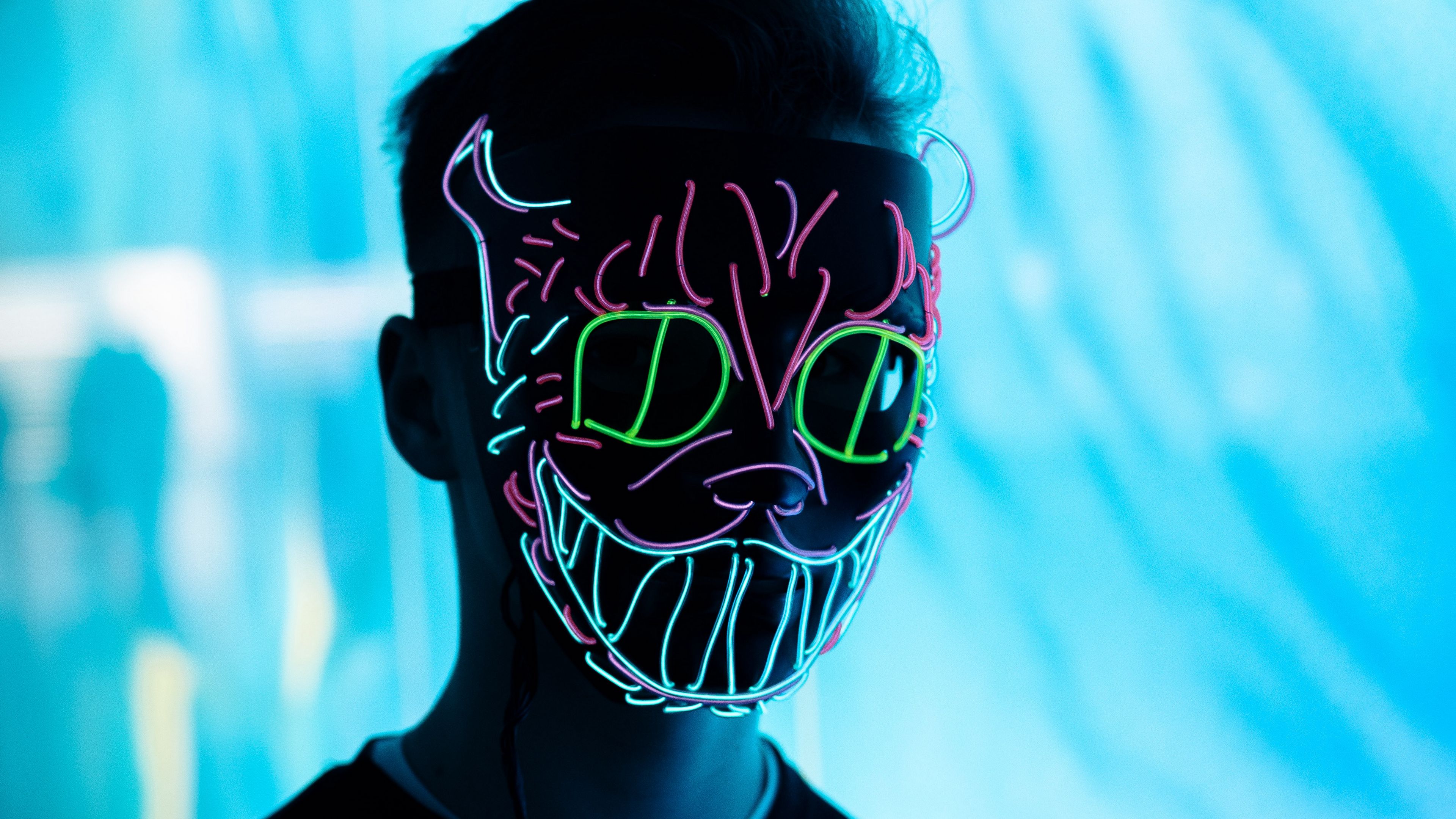 Description: A man with a neon mask on his face and a cat face painted on his face and the words do.