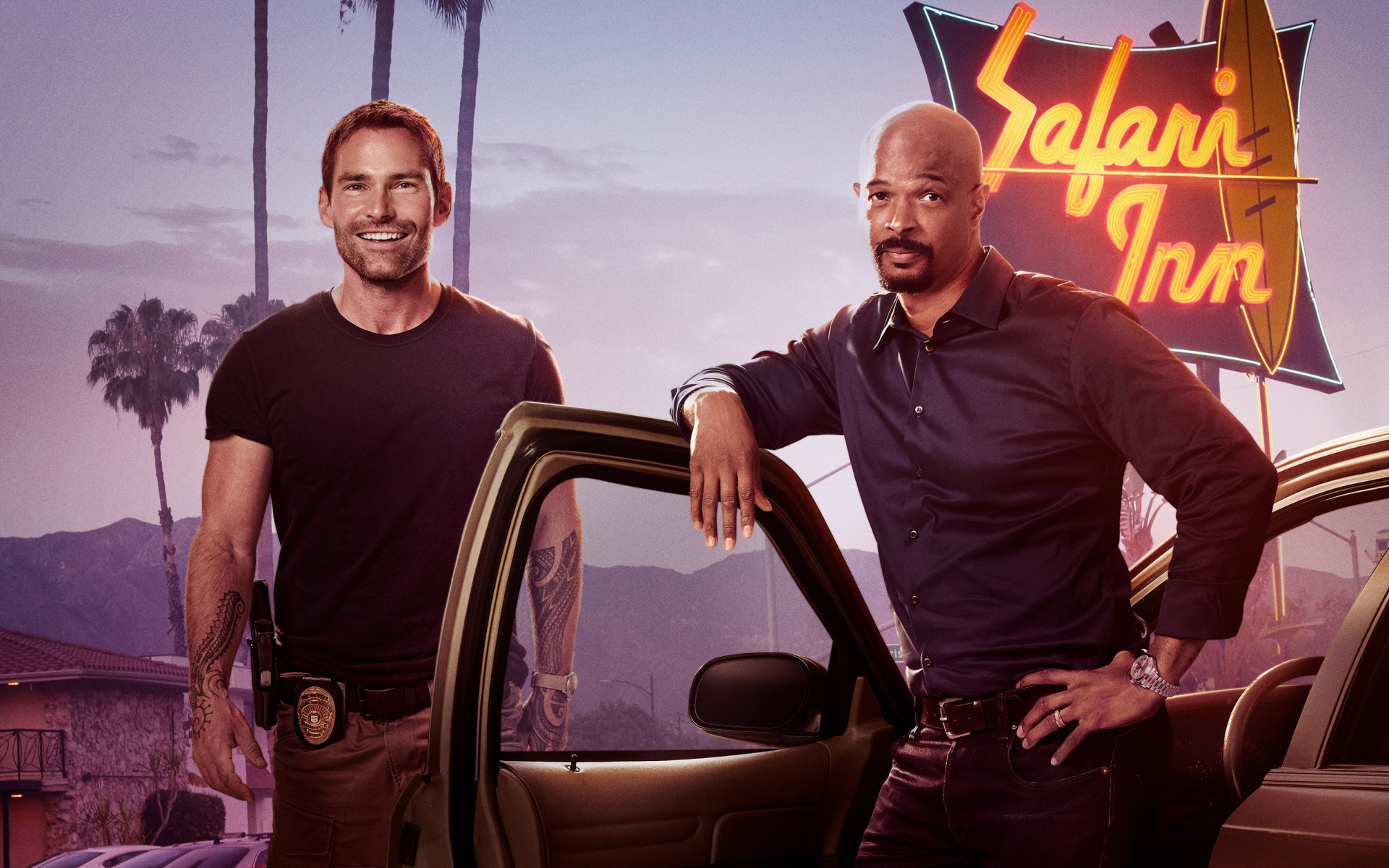 Description: Two men standing next to a car with a neon sign in the background and palm trees in the background.