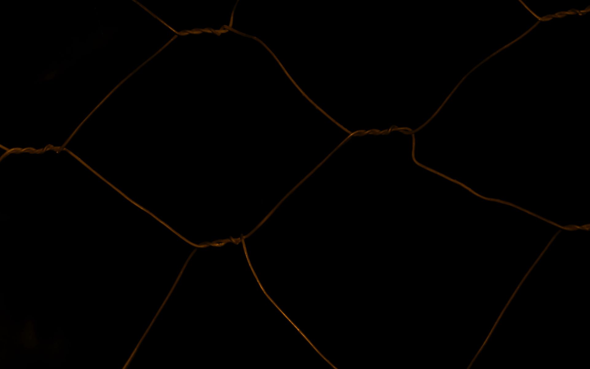 Description: A close up of a net with a black background and a yellow light in the middle of the net.