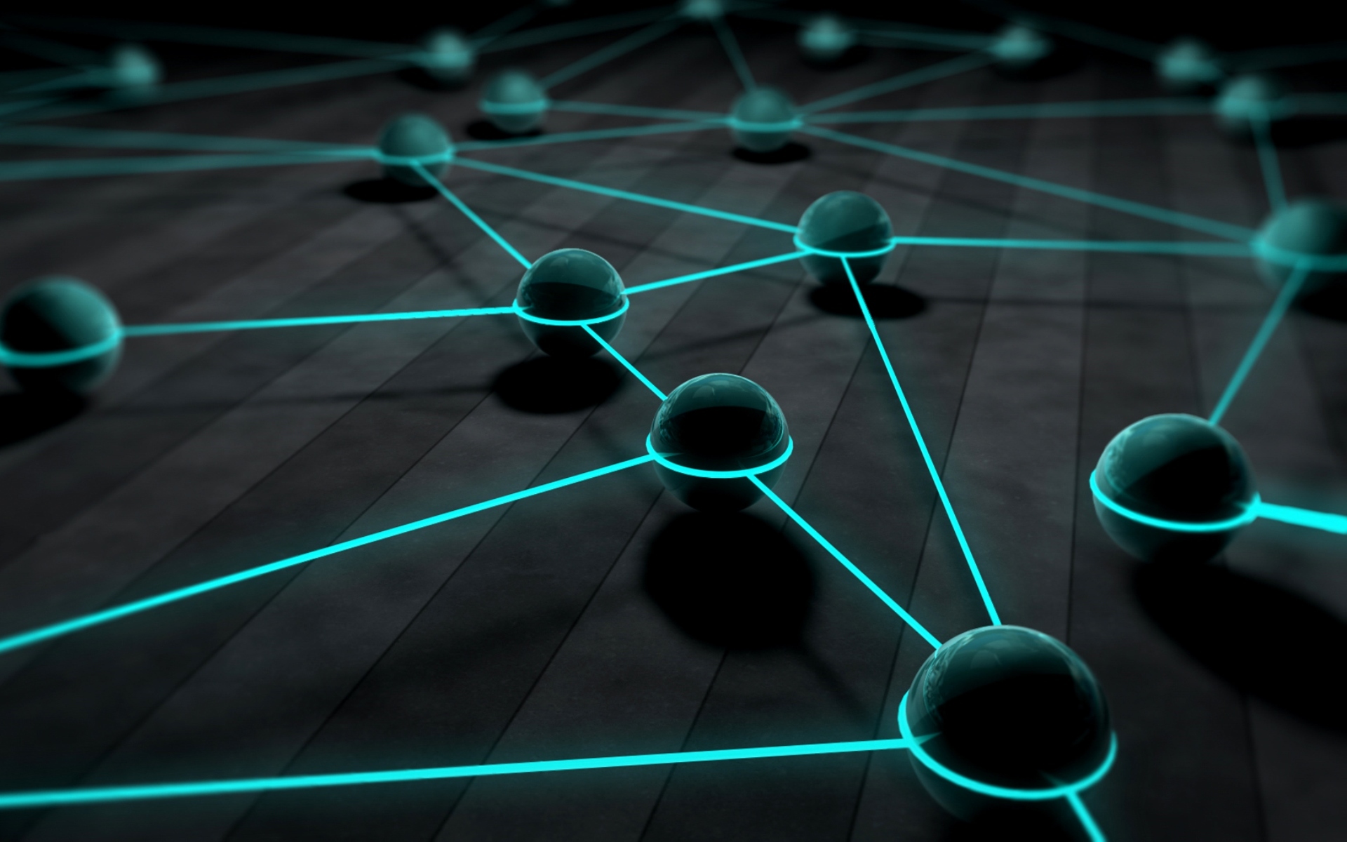 Description: A network of balls and lines on a floor with a black background and a blue glow on the floor.