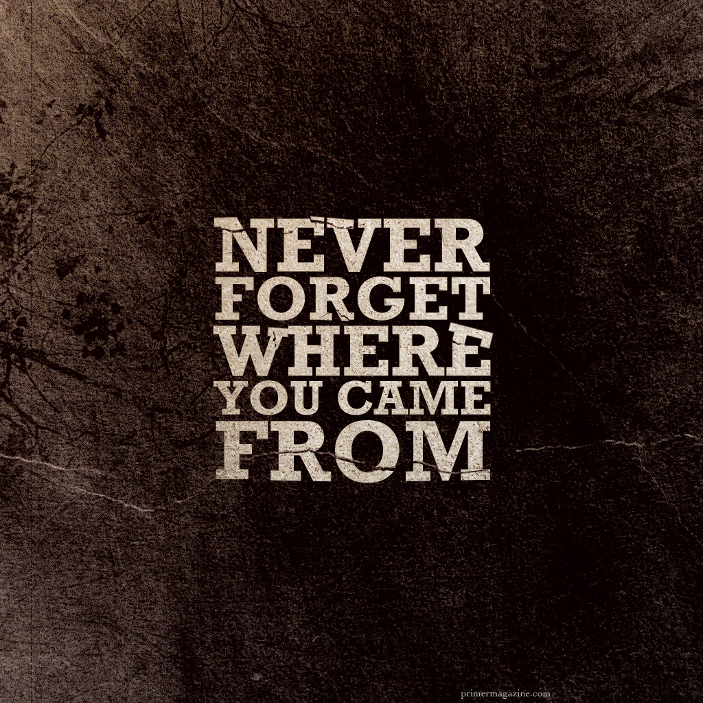 Description: A picture of a black and white picture with a quote on it that says never forget where you came from.