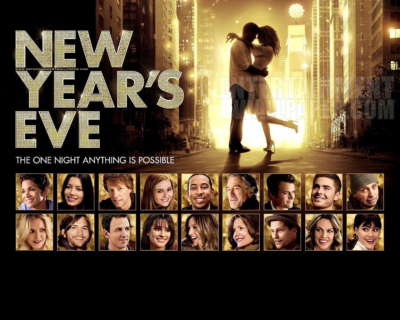 Description: A poster for a new year's eve movie with a couple kissing in the middle of a city.