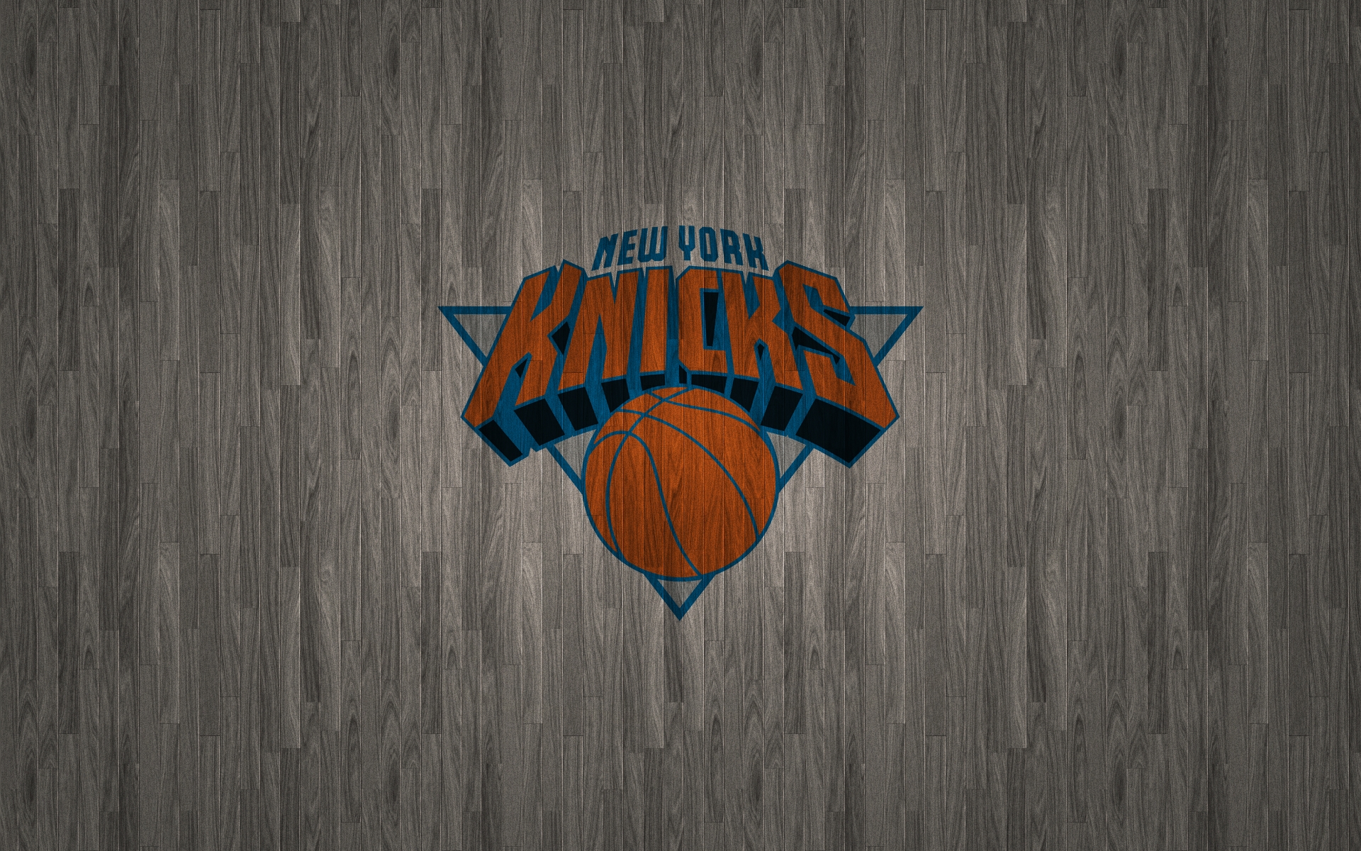 Description: A new york basketball team logo on a wooden floor with a gray background and a blue and orange basketball.