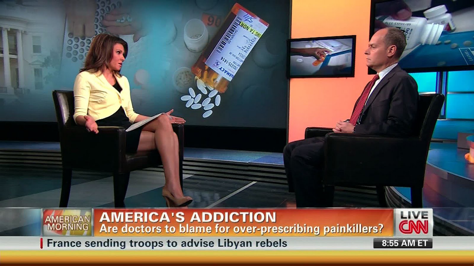 Description: A news anchor and a woman sitting in chairs talking to each other on a news show with a television screen behind them.