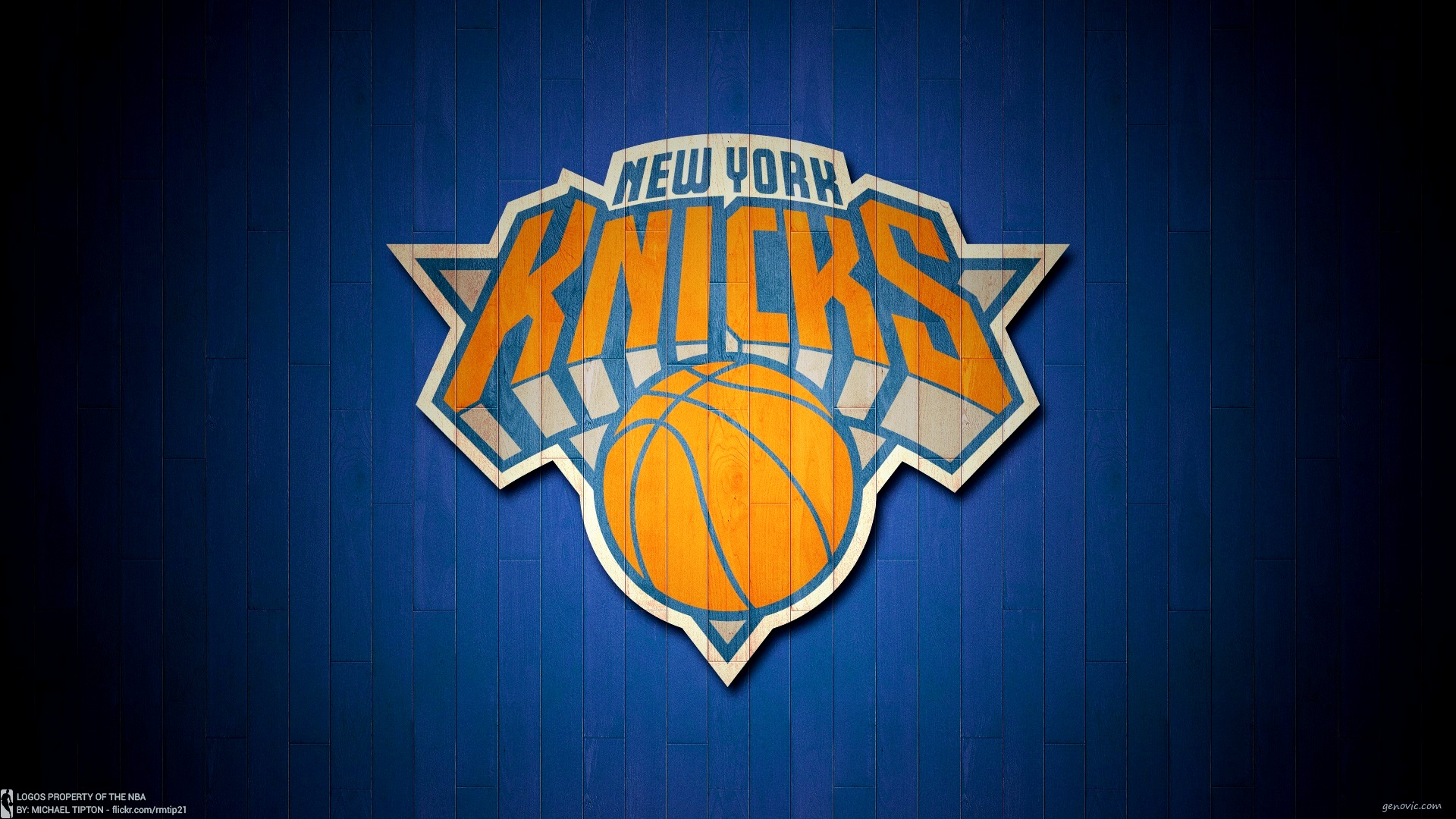 Description: A new york basketball logo on a blue wall with a blue background and a blue stripe pattern on the wall.