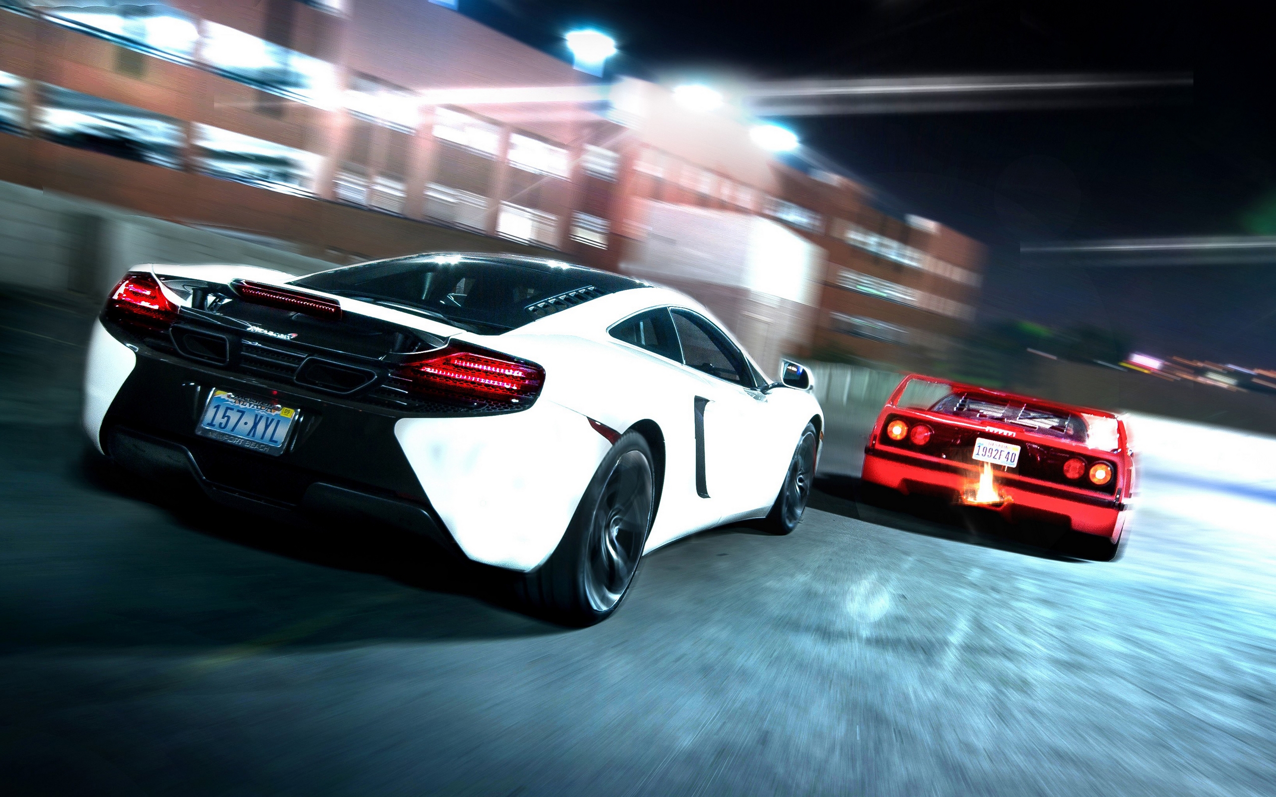 Description: Two cars driving down a street at night time with lights on and a building in the background with a sign that says.