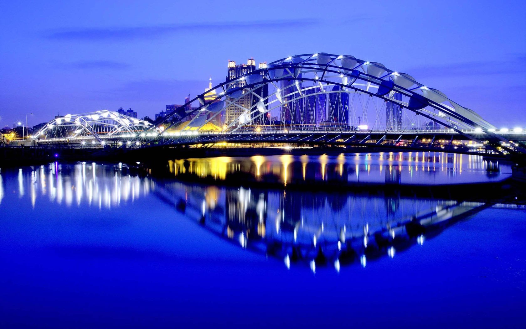 Description: A bridge that is over a body of water at night time with lights on it and a city in the background.