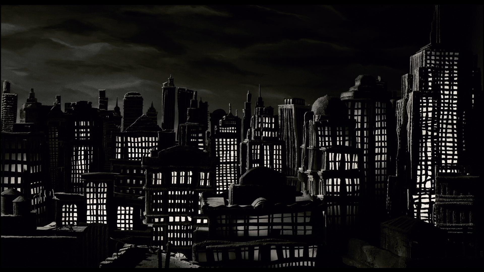 Description: A black and white photo of a city at night with a full moon in the sky above it and a dark sky.
