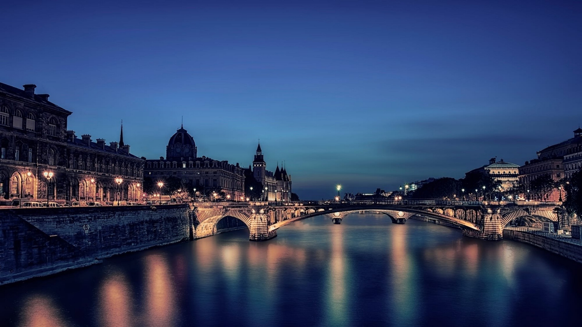 Description: A river running through a city at night with a bridge over it and buildings on both sides of the river.